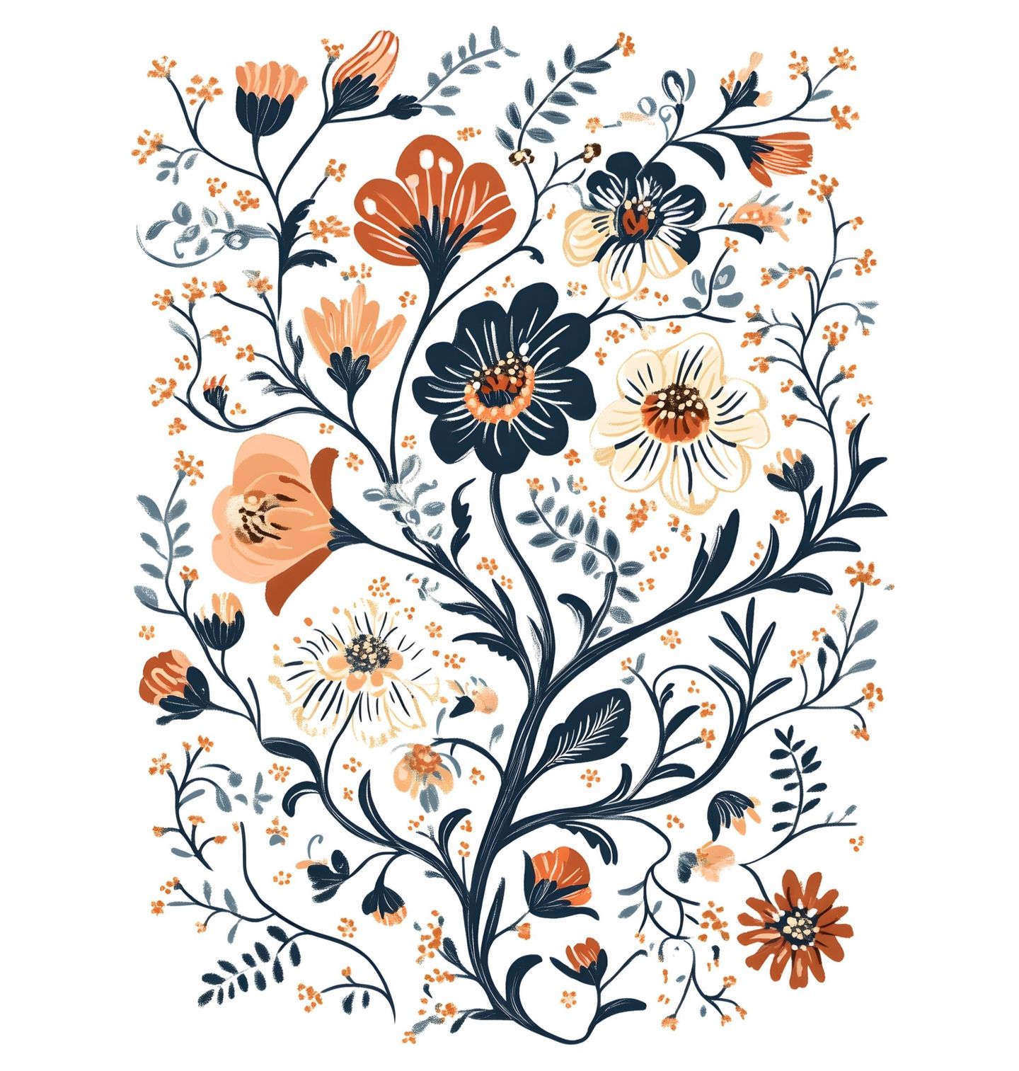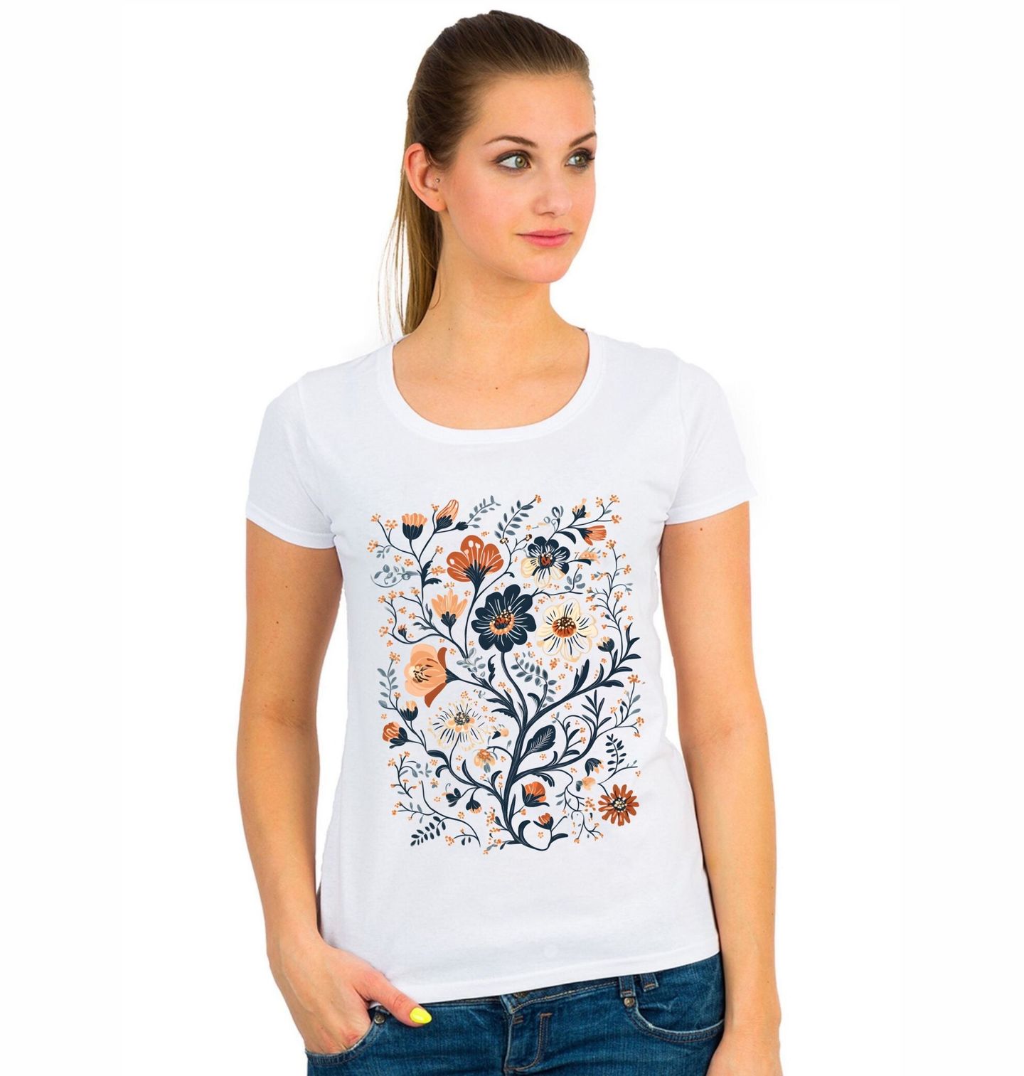 Dámské tričko Elegantní Květinový Design. Jemný a stylový motiv plný květin a rostlin v moderním ilustrativním stylu. Kombinace přírodních barev vytváří harmonický vzhled vhodný pro každodenní použití. Tento design ocení každý, kdo má rád květinové vzory, botaniku a přírodní motivy.