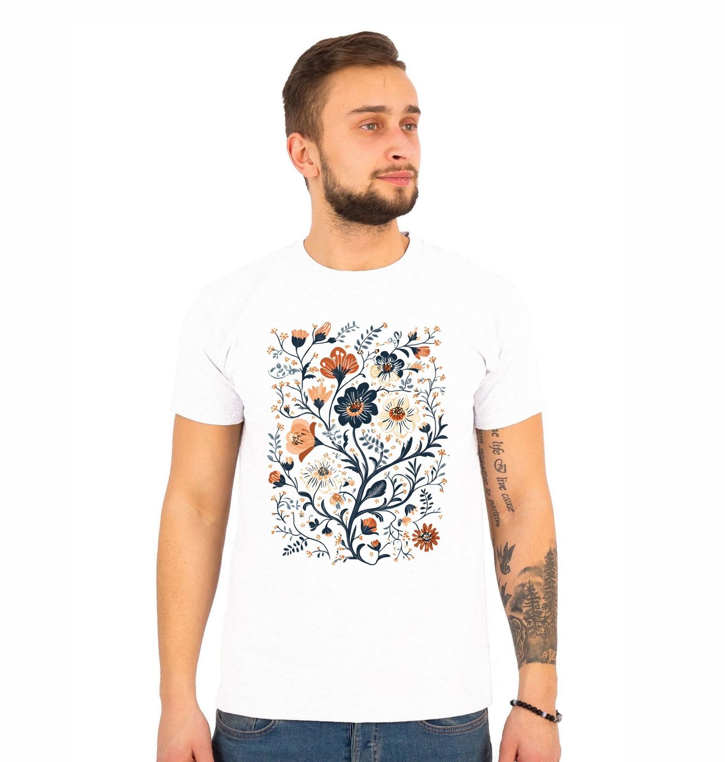 Pánské tričko Elegantní Květinový Design. Jemný a stylový motiv plný květin a rostlin v moderním ilustrativním stylu. Kombinace přírodních barev vytváří harmonický vzhled vhodný pro každodenní použití. Tento design ocení každý, kdo má rád květinové vzory, botaniku a přírodní motivy.
