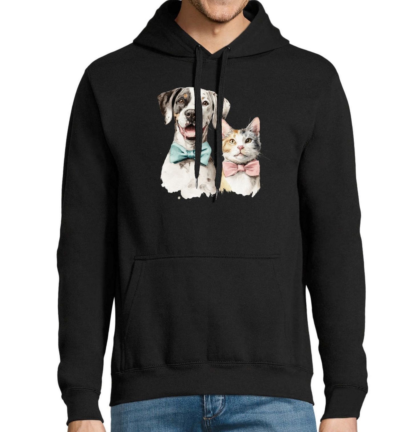 Pánská mikina Elegantní Pes a Kočka. Pro každého, kdo miluje psa, kočku a žije jako pravý pejskař. Akvarelový motiv zachycuje psa s modrým motýlkem a kočku s růžovým, jak pózují bok po boku. Pes pravděpodobně představuje plemeno dalmatin – rozpoznatelný podle bílé srsti s černými a šedými skvrnami. Kočka vypadá jako trikolorní kočka (calico) – charakteristická svou tříbarevnou srstí (bílá, oranžová, šedá/černá).