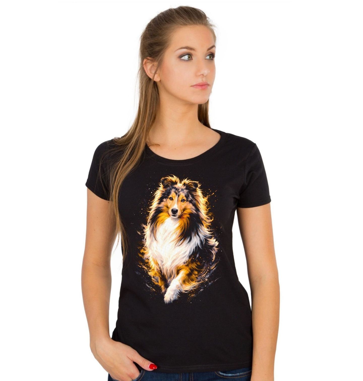 Dámské tričko Elegantní Šeltie. Tento nádherný motiv zachycuje plemeno Shetlandský ovčák (šeltie), které vyniká svou elegancí, inteligencí a oddaností. Tento krásný pes působí lehce, ladně a zároveň sebevědomě, což z něj dělá ideální motiv pro každého milovníka psů. Každý pejskař ocení detailní zpracování bohaté srsti i jemný výraz očí, který dokonale vystihuje citlivou a přátelskou povahu tohoto plemene.