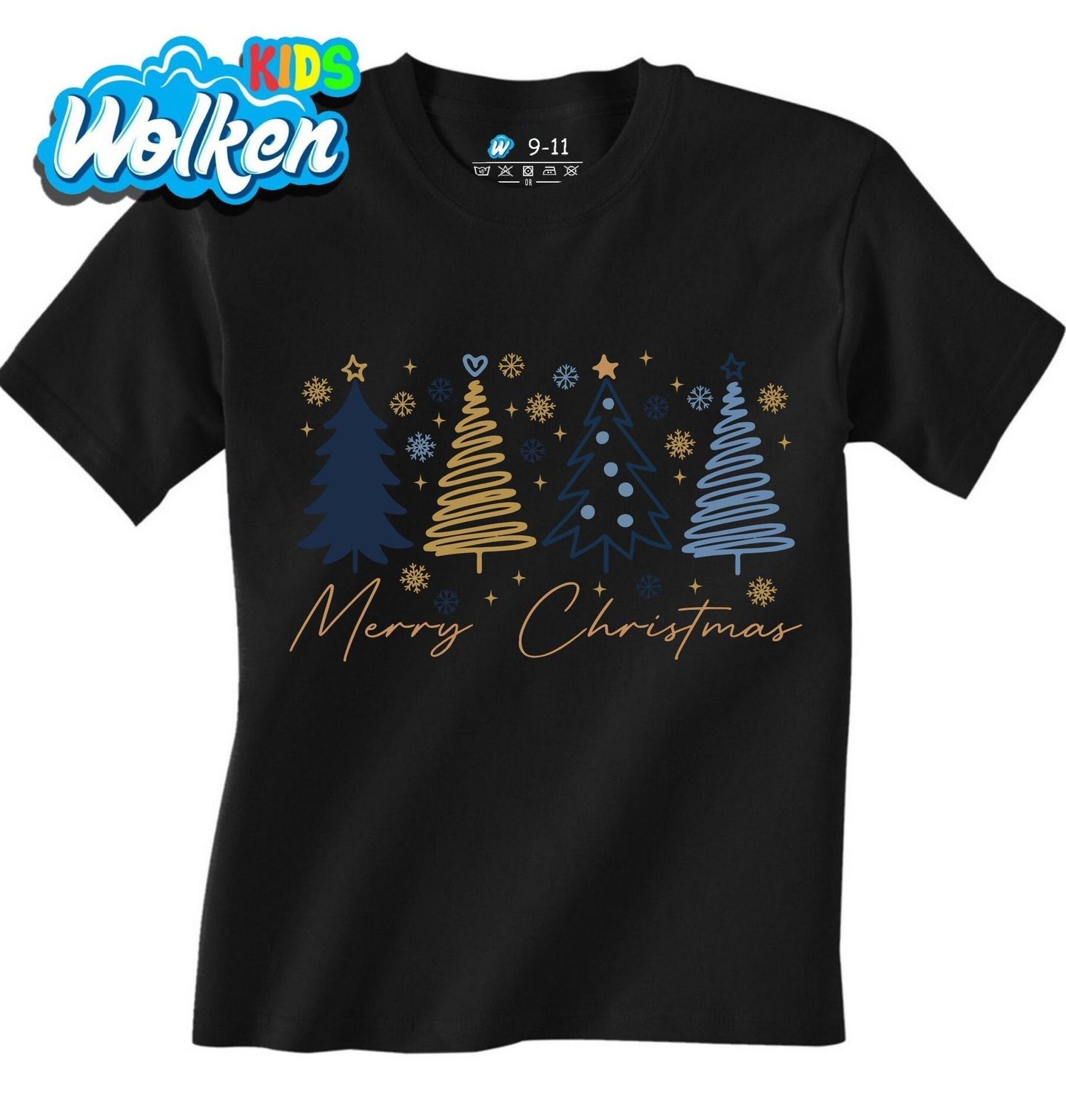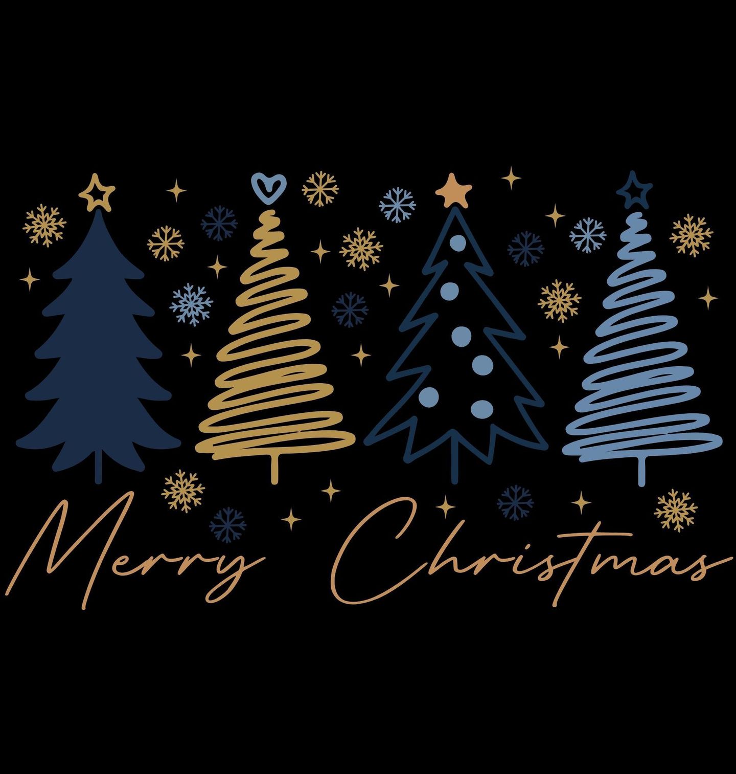 Dětské tričko Elegantní Vánoční Stromečky. Tento stylový motiv přináší kouzlo svátků v moderním pojetí. Čtyři vánoční stromečky v jemné kombinaci tmavě modré a zlaté, doplněné sněhovými vločkami a ručně psaným nápisem „Merry Christmas“ (Veselé Vánoce), osloví každého milovníka jednoduché elegance.