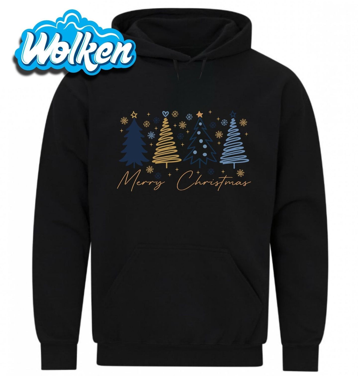 Pánská mikina Elegantní Vánoční Stromečky. Tento stylový motiv přináší kouzlo svátků v moderním pojetí. Čtyři vánoční stromečky v jemné kombinaci tmavě modré a zlaté, doplněné sněhovými vločkami a ručně psaným nápisem „Merry Christmas“ (Veselé Vánoce), osloví každého milovníka jednoduché elegance.