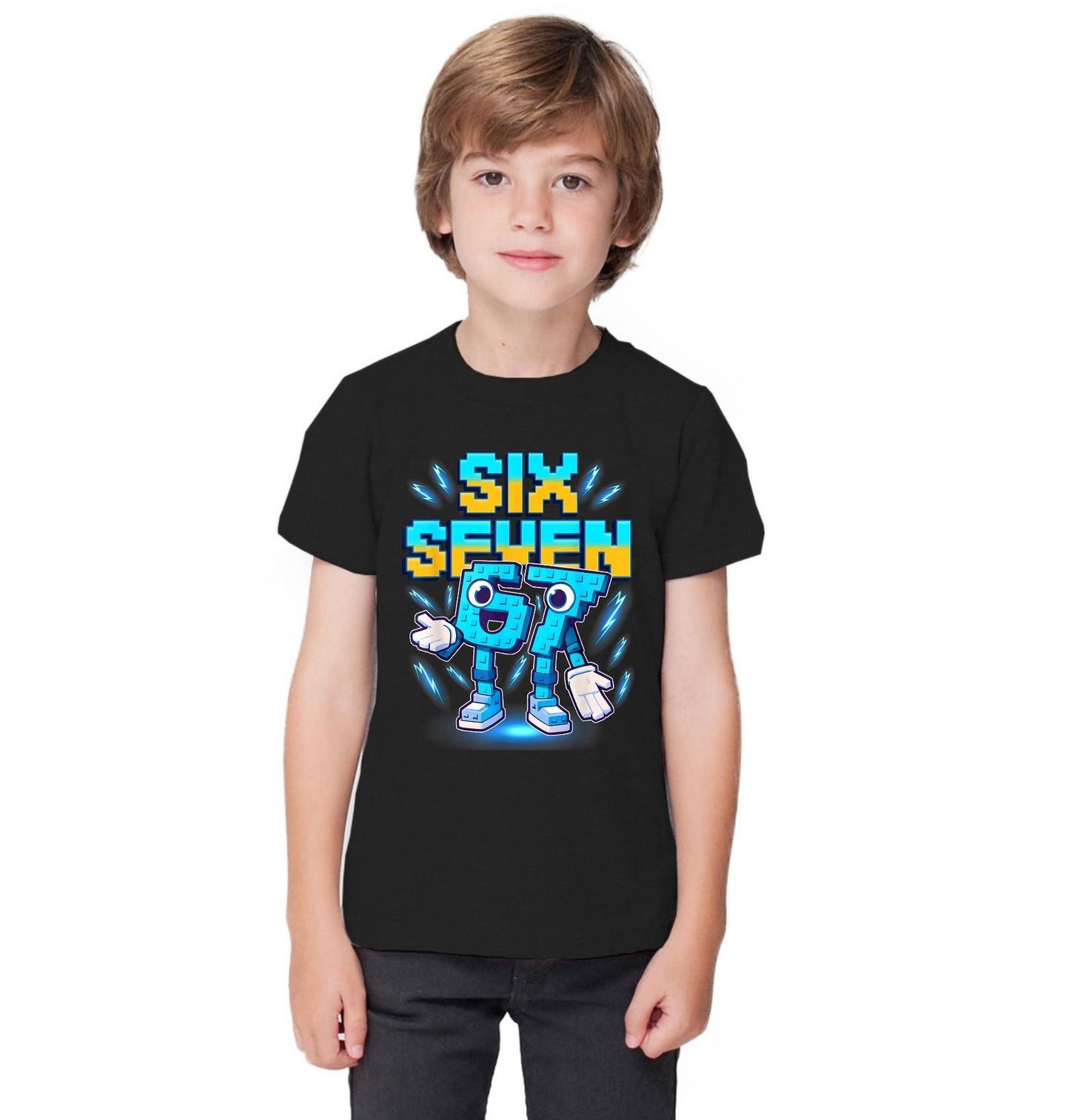 Dětské tričko Elektrická Čísla 67 Six Seven. Motiv 67 v hravém stylu six seven meme ukazuje veselá čísla 6 a 7 jako živé modré postavičky plné energie, kolem kterých září blesky. Čísla působí jako animované figurky z kostek a celý motiv je laděný do výrazných neonových barev. Ideální pro všechny, kdo mají rádi číslo 67, humor a originální meme motivy.