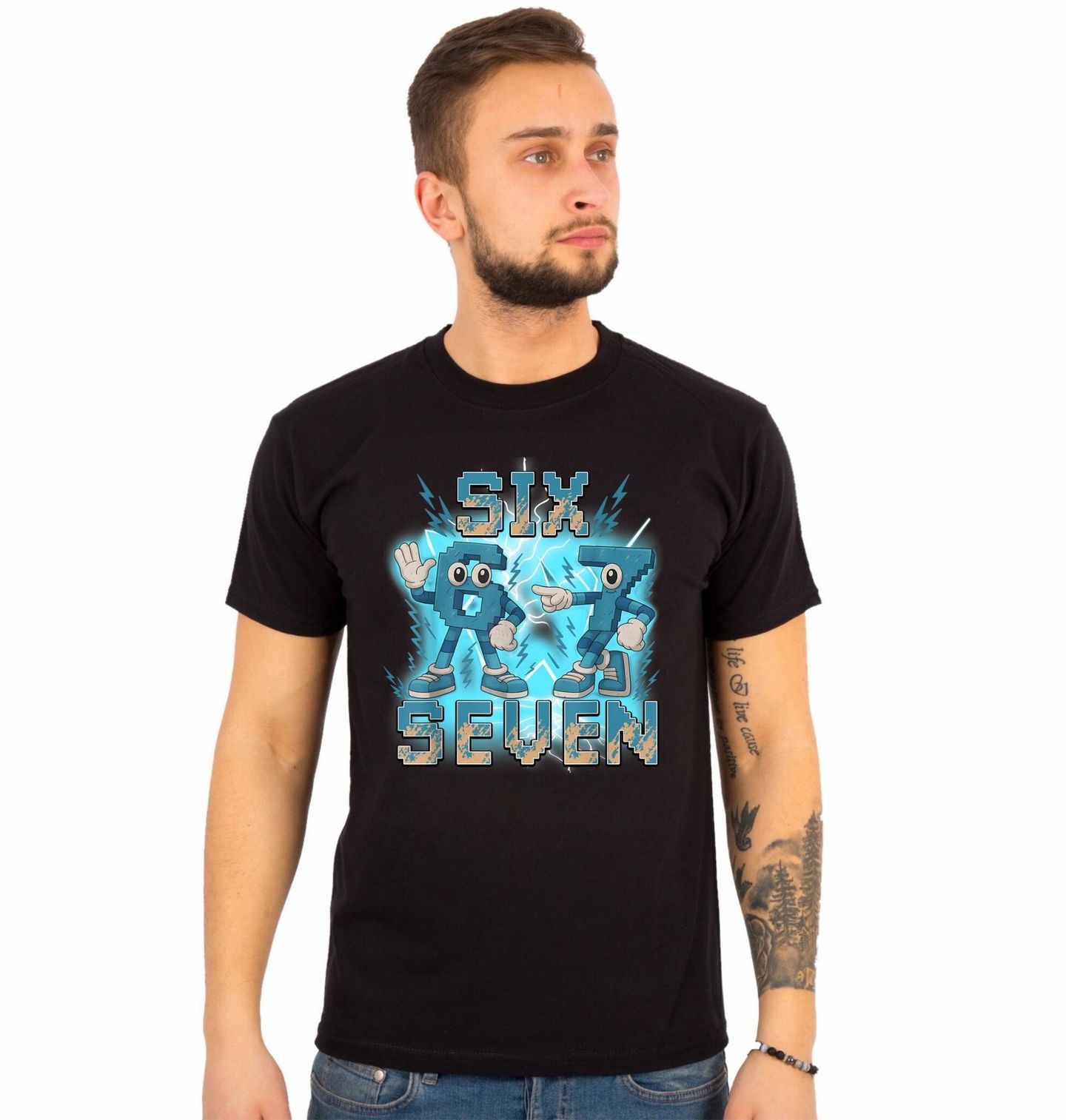 Pánské tričko Elektrizující 67 Six Seven. Motiv 67 ve stylu six seven meme. Čísla 6 a 7 jsou zobrazená jako modré kreslené postavičky s očima, rukama a nohama. Šestka má zvednutou ruku a sedmička na ni ukazuje prstem. Za nimi jsou modré blesky a výrazný nápis SIX SEVEN v pixelovém retro stylu. Veselý, hravý a výrazný motiv 67 pro fanoušky humoru a internetových meme.
