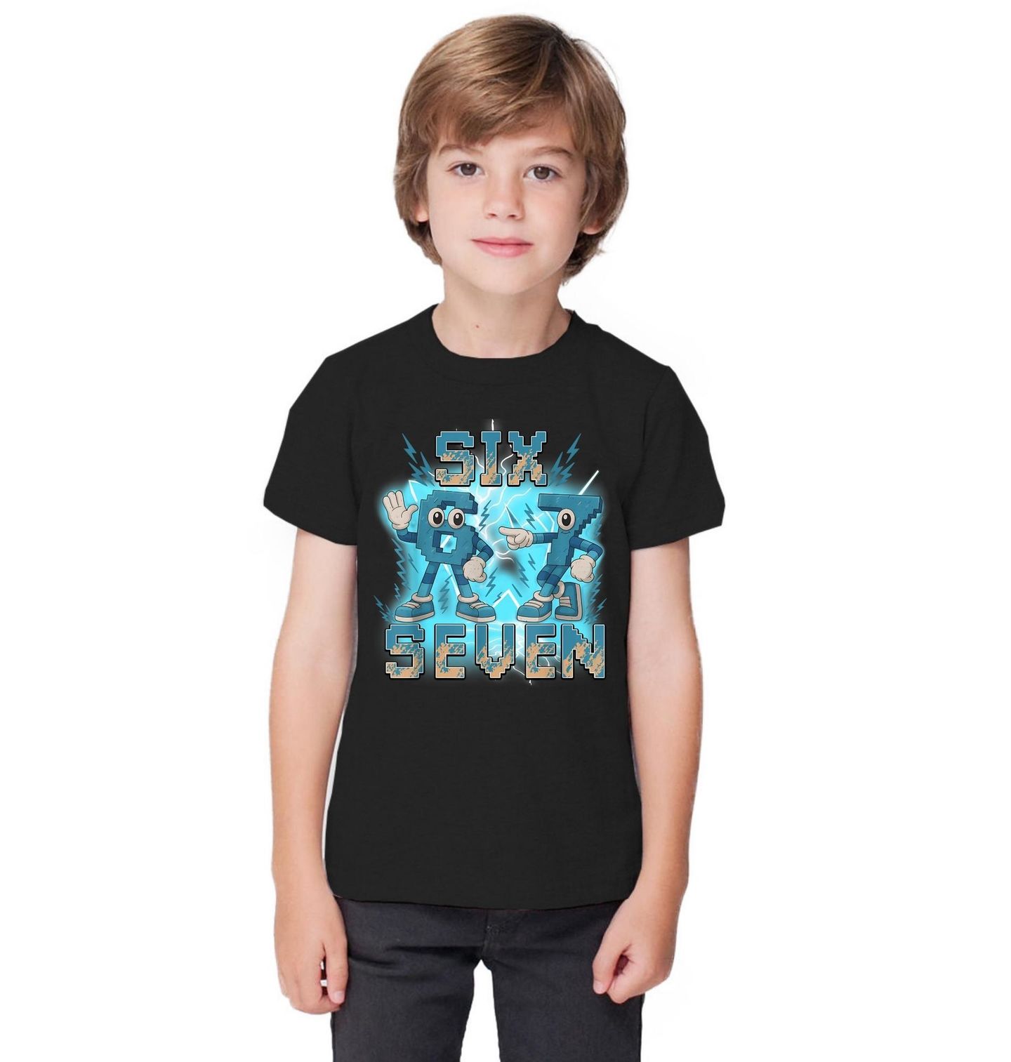 Dětské tričko Elektrizující 67 Six Seven. Motiv 67 ve stylu six seven meme. Čísla 6 a 7 jsou zobrazená jako modré kreslené postavičky s očima, rukama a nohama. Šestka má zvednutou ruku a sedmička na ni ukazuje prstem. Za nimi jsou modré blesky a výrazný nápis SIX SEVEN v pixelovém retro stylu. Veselý, hravý a výrazný motiv 67 pro fanoušky humoru a internetových meme.