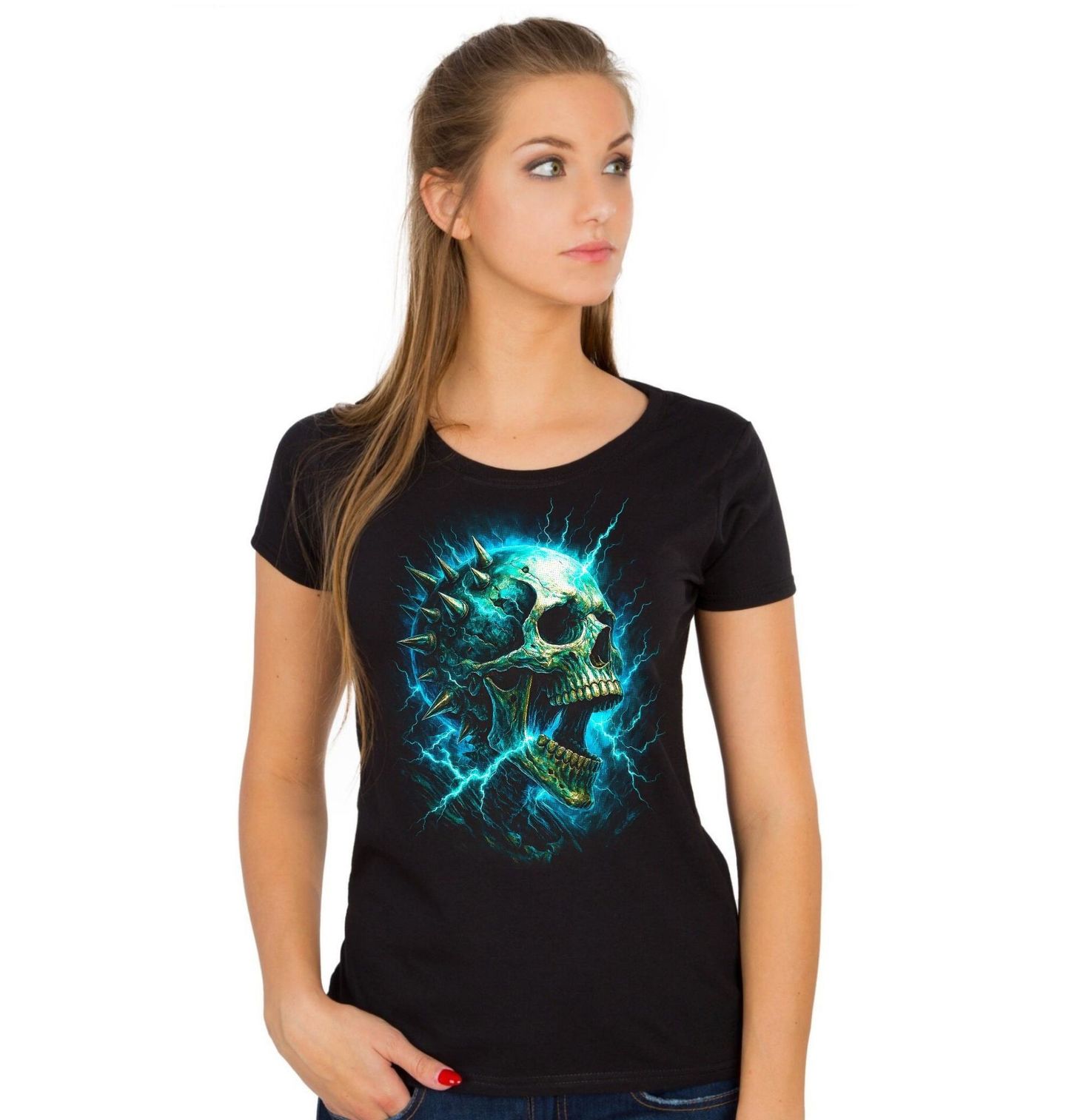 Dámské tričko Elektrizující Lebka. Temná energie, která se nedá zkrotit. Tento výrazný motiv zachycuje lebka prostoupenou silou, kterou představuje elektřina v její nejdivočejší podobě. Praskající výboje, ostré detaily a agresivní styl vytváří jedinečný design, který okamžitě přitáhne pozornost. Ideální volba pro všechny, kdo milují temnou estetiku, rebelii a sílu skrytou pod povrchem. Tento motiv není jen obrázek – je to symbol vnitřní energie, chaosu a nespoutané individuality.