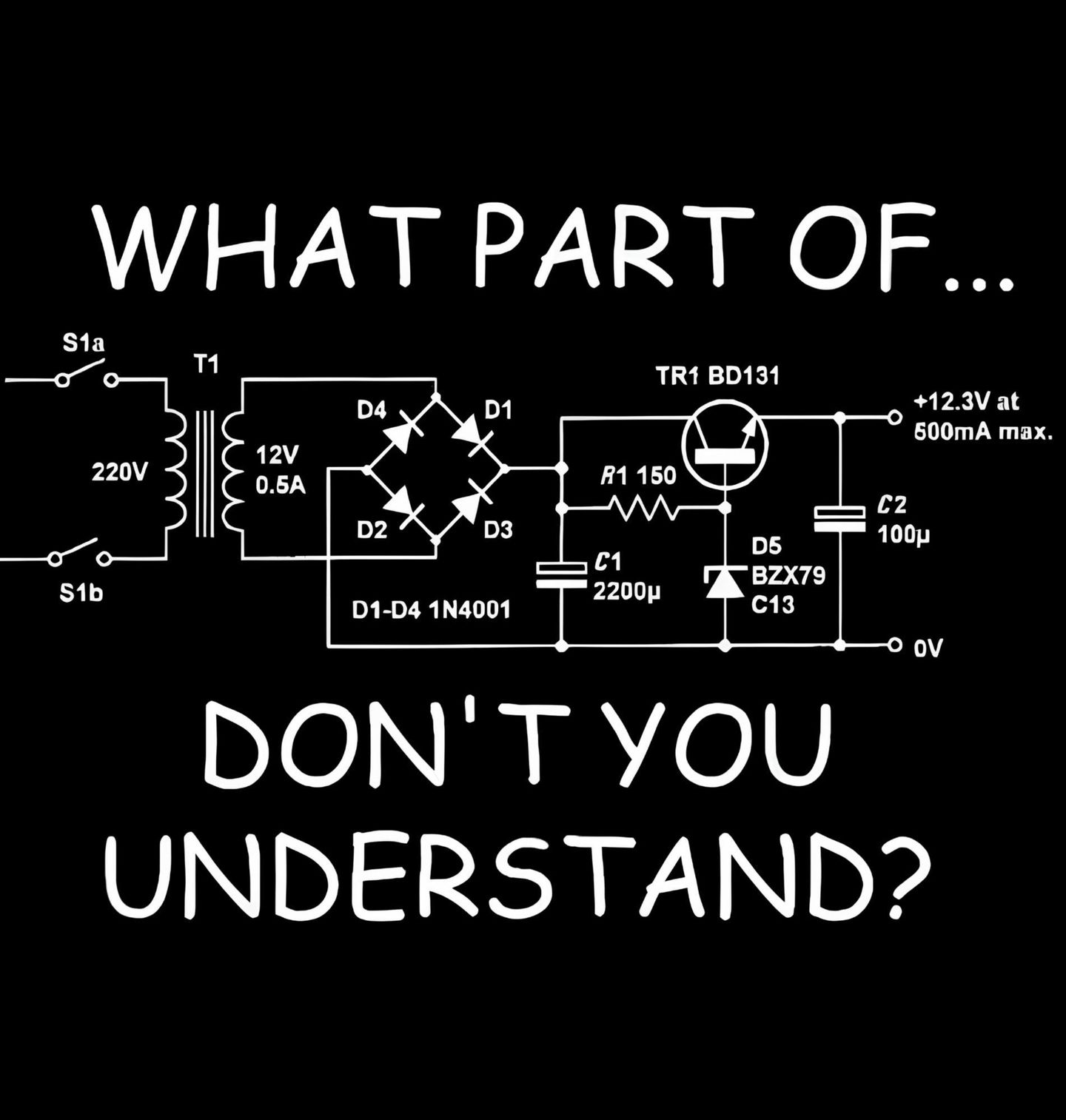 Pánské tričko Elektronický Obvod Čemu na tom nerozumíš? What part of...dont you understand? Na motivu je Schéma napájecího zdroje. Dejte jasně najevo svou technickou převahu s tímto vtipným motivem, který je určen pro skutečné mistry v oboru elektrotechniky. Design s propracovaným schématem zapojení a trefnou otázkou okamžitě „vyzkratuje“ každého laika, který se pokusí o diskuzi. Je to ideální kousek pro elektrikáře, bastlíře a inženýry, kteří raději mluví v diagramech než ve slovech.