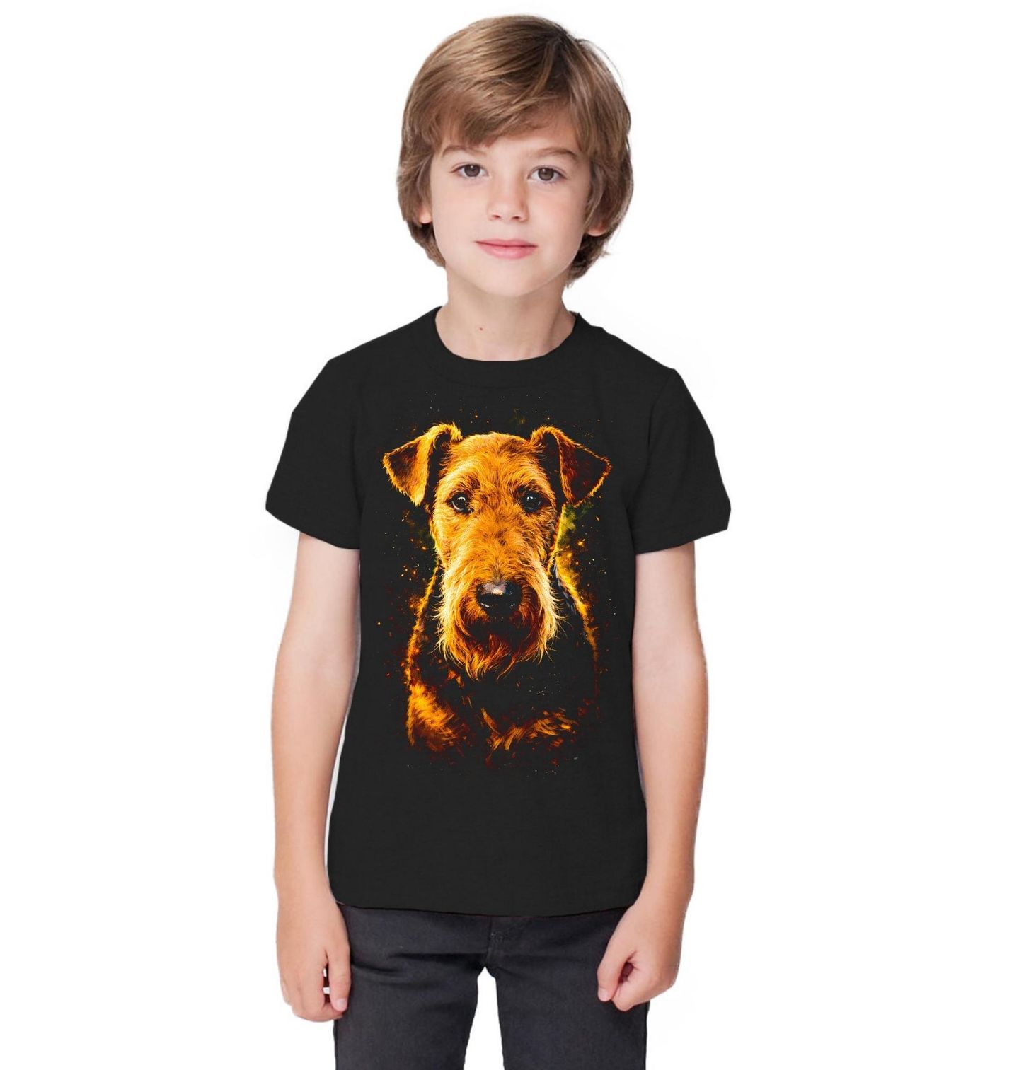 Dětské tričko Erdelteriér Airedale teriér. Airedale teriér je odvážný, inteligentní a velmi všestranný pes, který vyniká svou energií i oddaností rodině. Je ideální pro aktivní pejskař, který ocení jeho hravou povahu, učenlivost a přirozený ochranářský instinkt. Detailní ilustrace zvýrazňuje typickou drsnou srst, dlouhý čenich a bystrý, inteligentní pohled, díky kterému je tento pes nazýván „králem teriérů“.