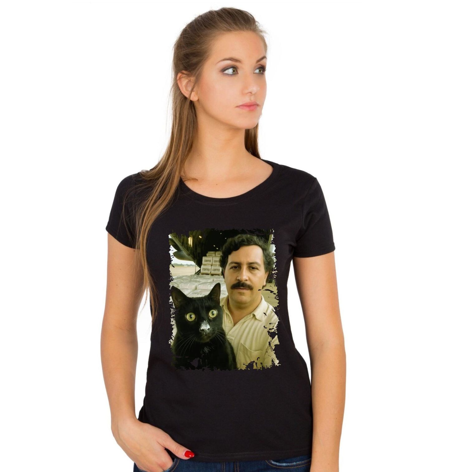 Dámské tričko Escobarova Černá Kočka Kartelu. Pablo Escobar a černá kočka před velkými pytli, které na první pohled připomínají kávu, ale ve skutečnosti jde o kokain a drogy. Motiv staví na nadsázce a kontrastu mezi temnou legendou a vtipnou coffee atmosférou, díky čemuž působí provokativně i zábavně zároveň.
