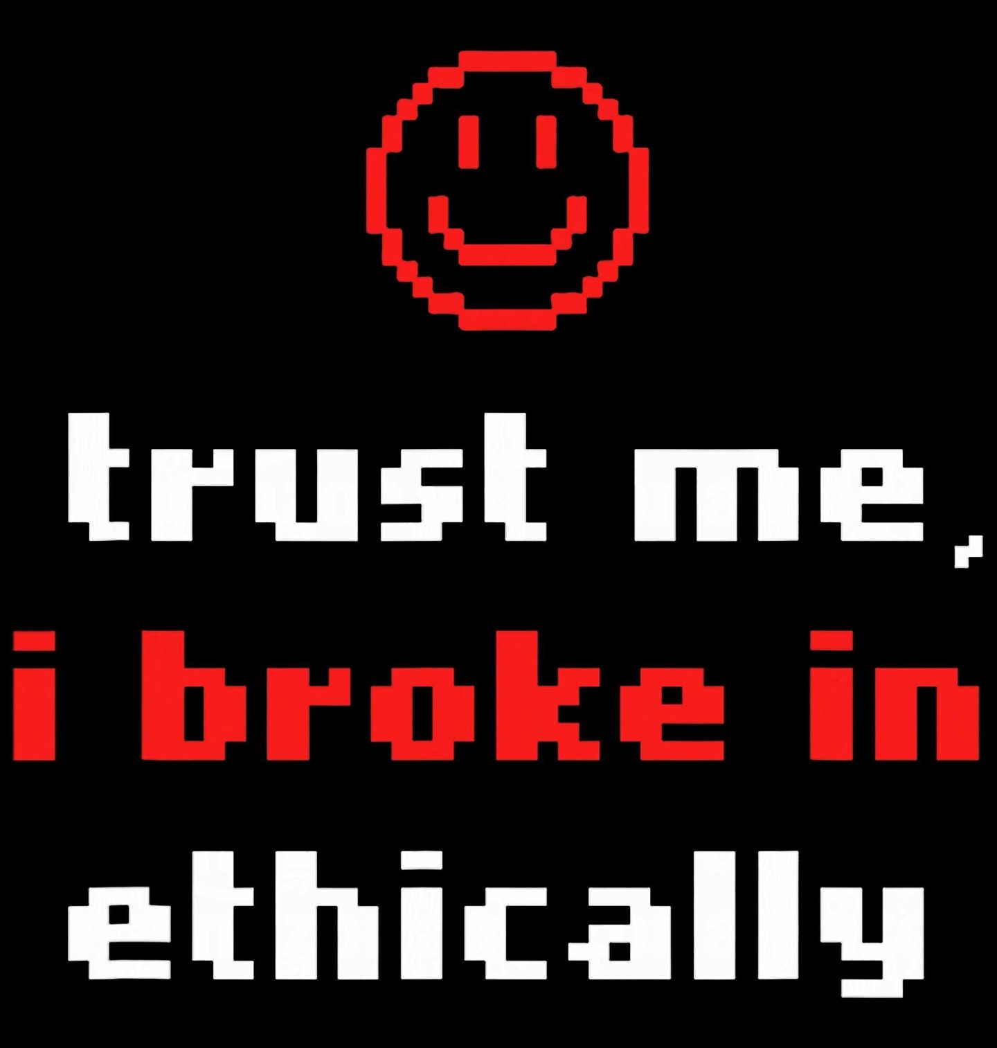 Pánské tričko Etický Hacker Styl. Moderní pixelový design s textem „Trust me, I broke in ethically“, což znamená „Věř mi, naboural jsem se eticky“. Ideální design pro IT nadšence, hackery a milovníky kybernetické bezpečnosti s nadsázkou a humorem.