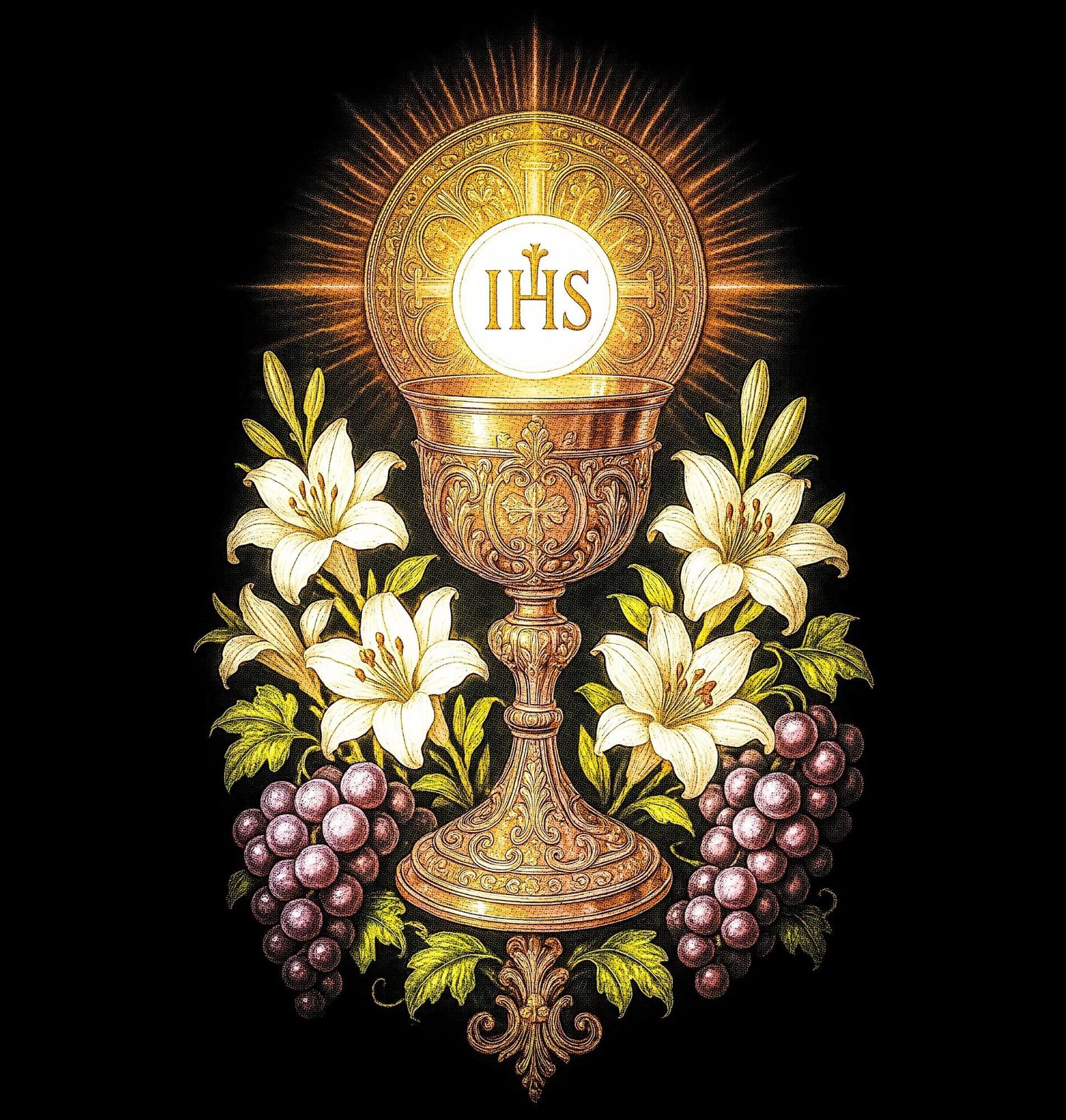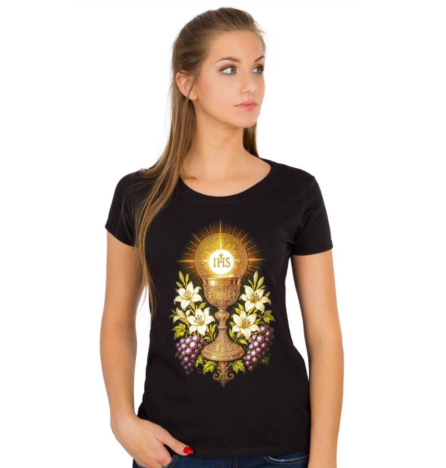 Dámské tričko Eucharistický Kalich Tělo a krev Krista. Tento motiv zobrazuje eucharistický kalich s hostií, jeden z nejposvátnějších symbolů křesťanské víry. Kalich představuje krev Krista, hostie pak jeho tělo, jak je chápáno v rámci eucharistie – svátosti, která stojí v centru křesťanství. IHS je latinsky Iesus Hominum Salvator - česky Ježíš, Spasitel lidstva.