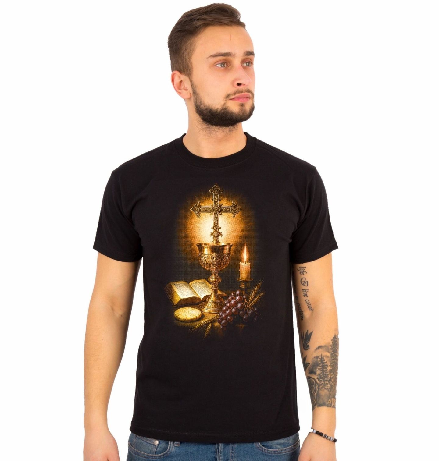 Pánské tričko Eucharistie Poslední večeře Ježíše Krista. Eucharistie je křesťanský obřad, známý také jako mše svatá nebo Večeře Páně, který připomíná poslední večeři Ježíše Krista. Věřící při něm konzumují proměněný chléb a víno. Tento hluboce symbolický motiv zachycuje eucharistickou scénu s kalichem, křížem, chlebem, vínem a biblí. Ideální motiv pro ty, kteří chtějí vyjádřit svou víru v křesťanství.