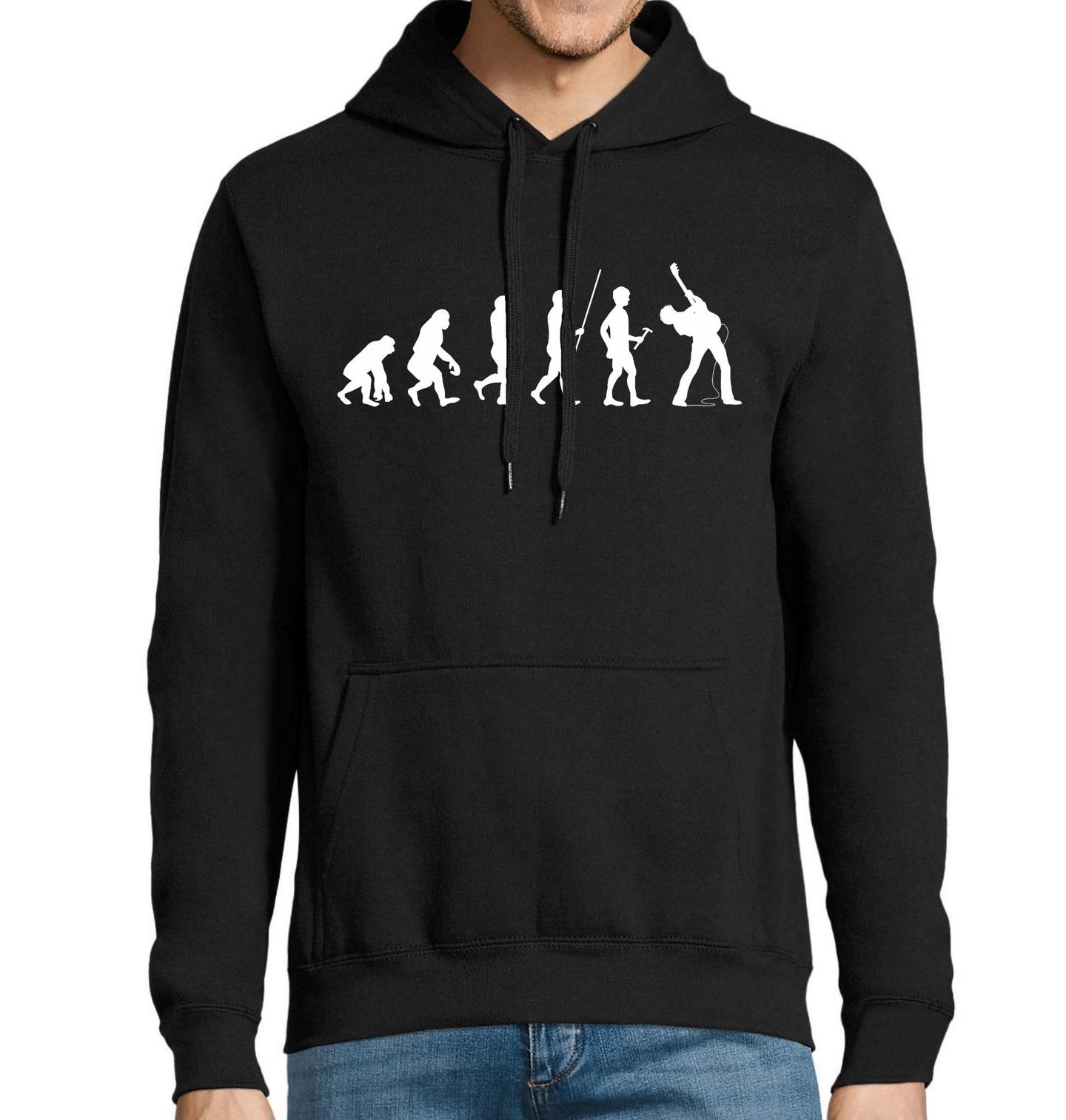 Pánská mikina Evoluce Kytaristy. Motiv spojuje humor, nadsázku a lásku k hudbě. Evoluce zde vrcholí postavou kytaristy, který představuje svobodu, kreativitu a odhodlání jít vlastní cestou. Rock and roll není jen hudební styl, ale životní filozofie, která inspiruje generace muzikantů i fanoušků. Ideální volba pro každého, kdo miluje rock and roll, hraje na kytaru nebo chce originálně vyjádřit svou hudební identitu.