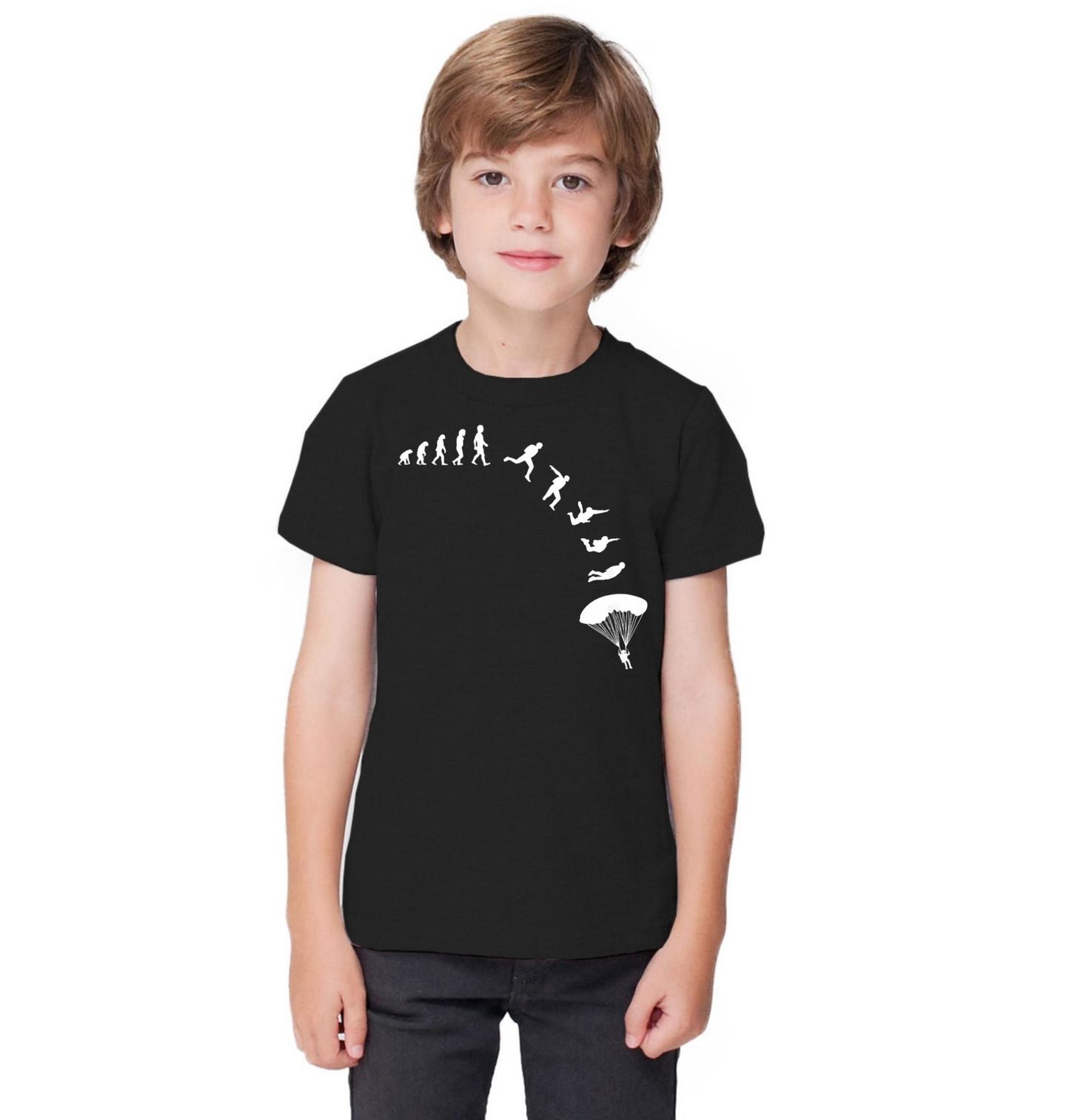 Dětské tričko Evoluce Parašutisty. Vtipný motiv ukazuje postupnou evoluci člověka až k okamžiku, kdy se z něj stává parašutista, který skáče z výšky a otevírá padák. Motiv symbolizuje touhu po svobodě, adrenalinu a létání. Vhodný dárek pro všechny nadšené parašutisty.