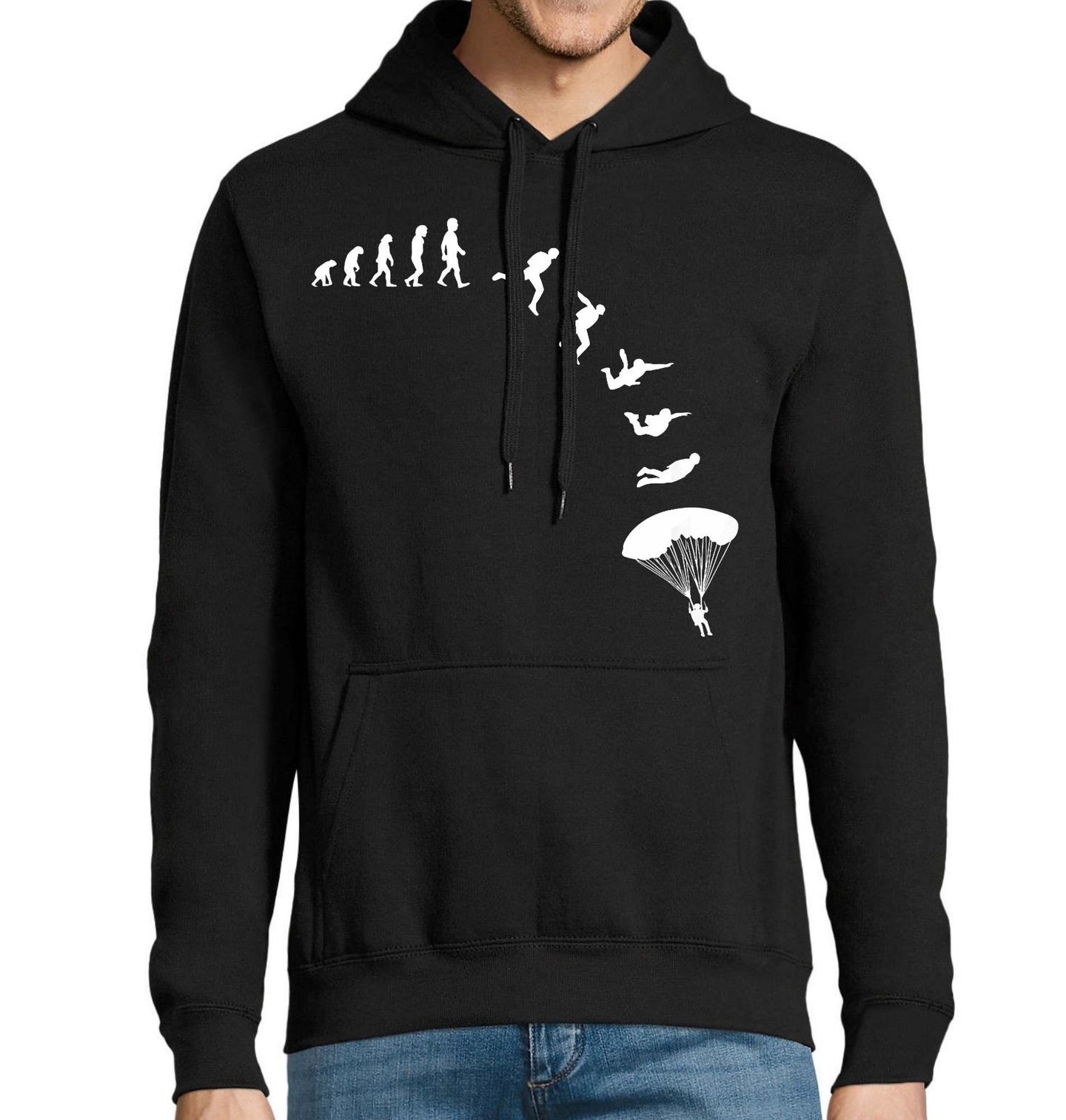 Pánská mikina Evoluce Parašutisty. Vtipný motiv ukazuje postupnou evoluci člověka až k okamžiku, kdy se z něj stává parašutista, který skáče z výšky a otevírá padák. Motiv symbolizuje touhu po svobodě, adrenalinu a létání. Vhodný dárek pro všechny nadšené parašutisty.