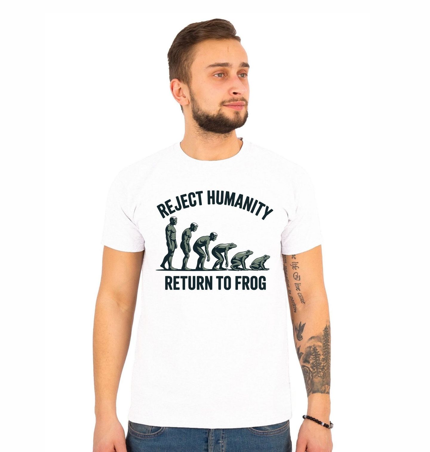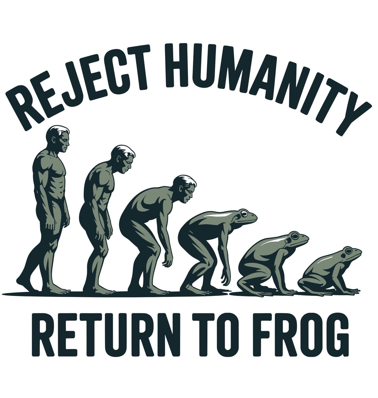 Pánské tričko Evoluce Žáby Odmítni lidství, vrať se k žábě. Ilustrace ukazuje, jak se člověk postupně „vyvíjí zpět“ až do podoby, kterou je žába. Tento nápaditý design kombinuje humor, nadsázku a lehce ironický pohled na moderní společnost. Text na motivu zní: “REJECT HUMANITY – RETURN TO FROG”, což v překladu znamená: „Odmítni lidství – vrať se k žábě.“