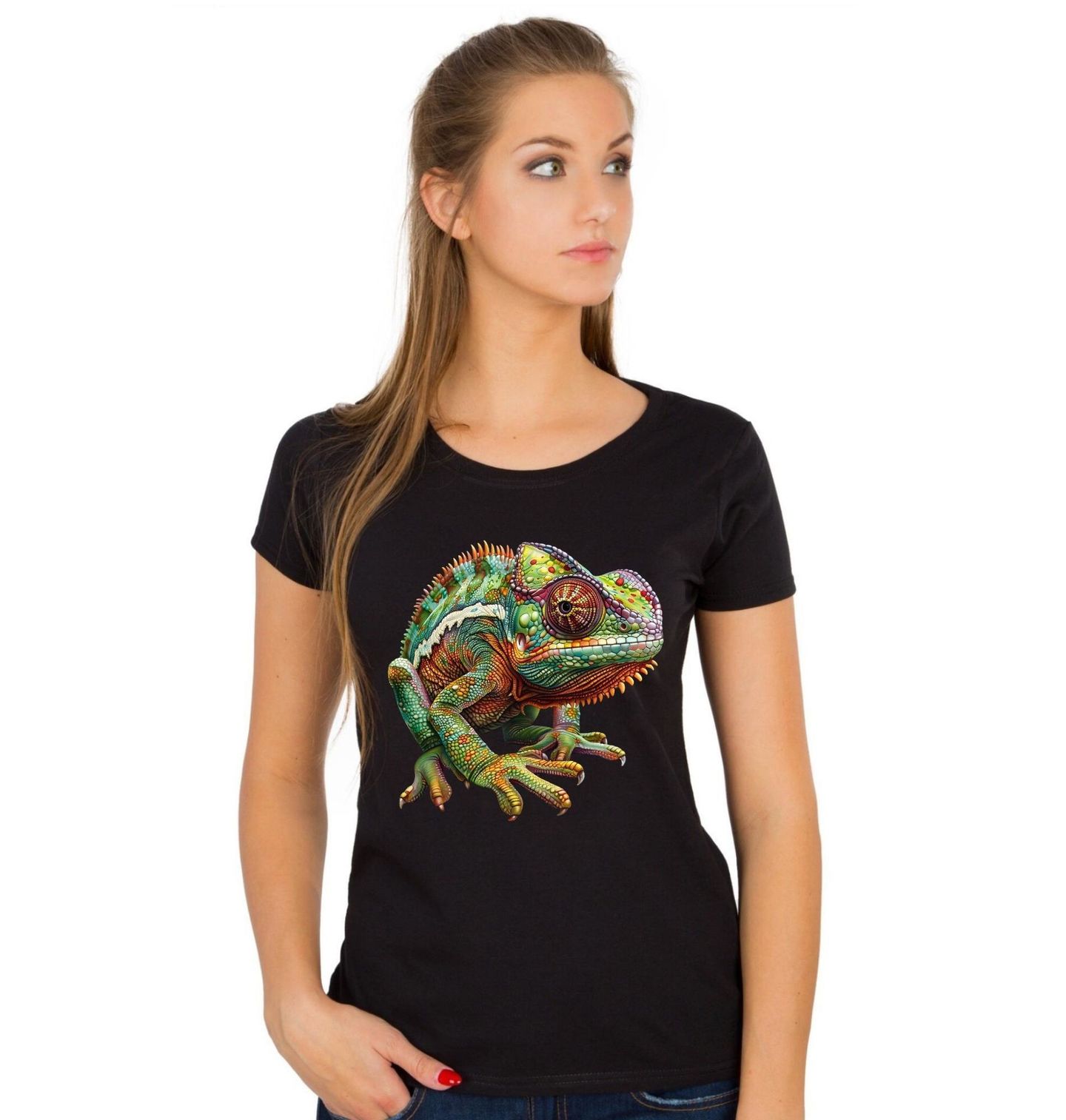 Dámské tričko Exotický Chameleon. Chameleon v sytých barvách je zachycený v typické póze s důrazem na strukturu kůže, oči a prsty. Celý design působí živě, exoticky a lehce umělecky – ideální pro každého, koho fascinuje svět přírody a neobyčejných zvířat. Tento motiv osloví hlavně teraristy.