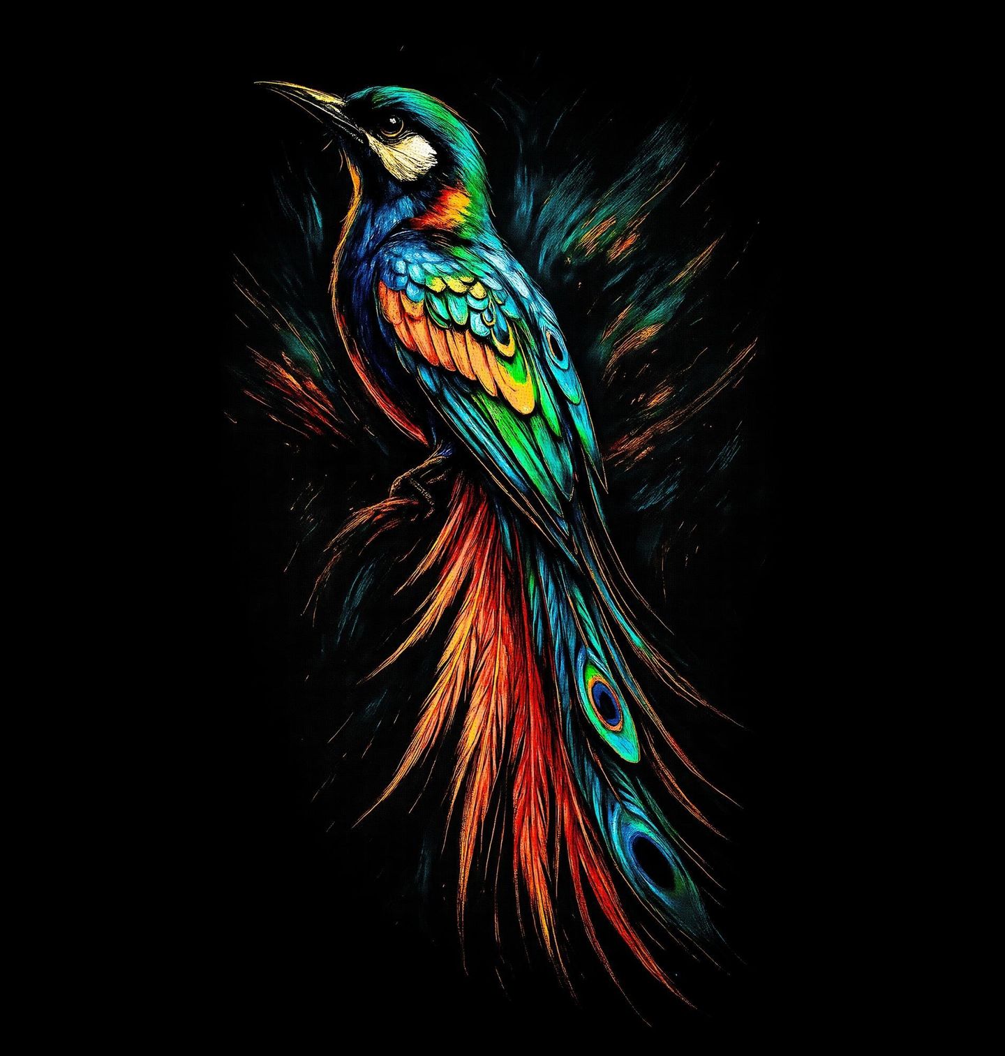 Dámské tričko Exotický Páv. Tento výrazný motiv zobrazuje majestátního ptáka inspirovaného pávem, který vyniká dlouhým, bohatě zdobeným ocasem a zářivými barvami. Pták působí elegantně, sebevědomě a exoticky, jeho peří hraje odstíny modré, zelené, tyrkysové i ohnivé oranžové. Detailní zpracování dodává motivu luxusní a umělecký vzhled.