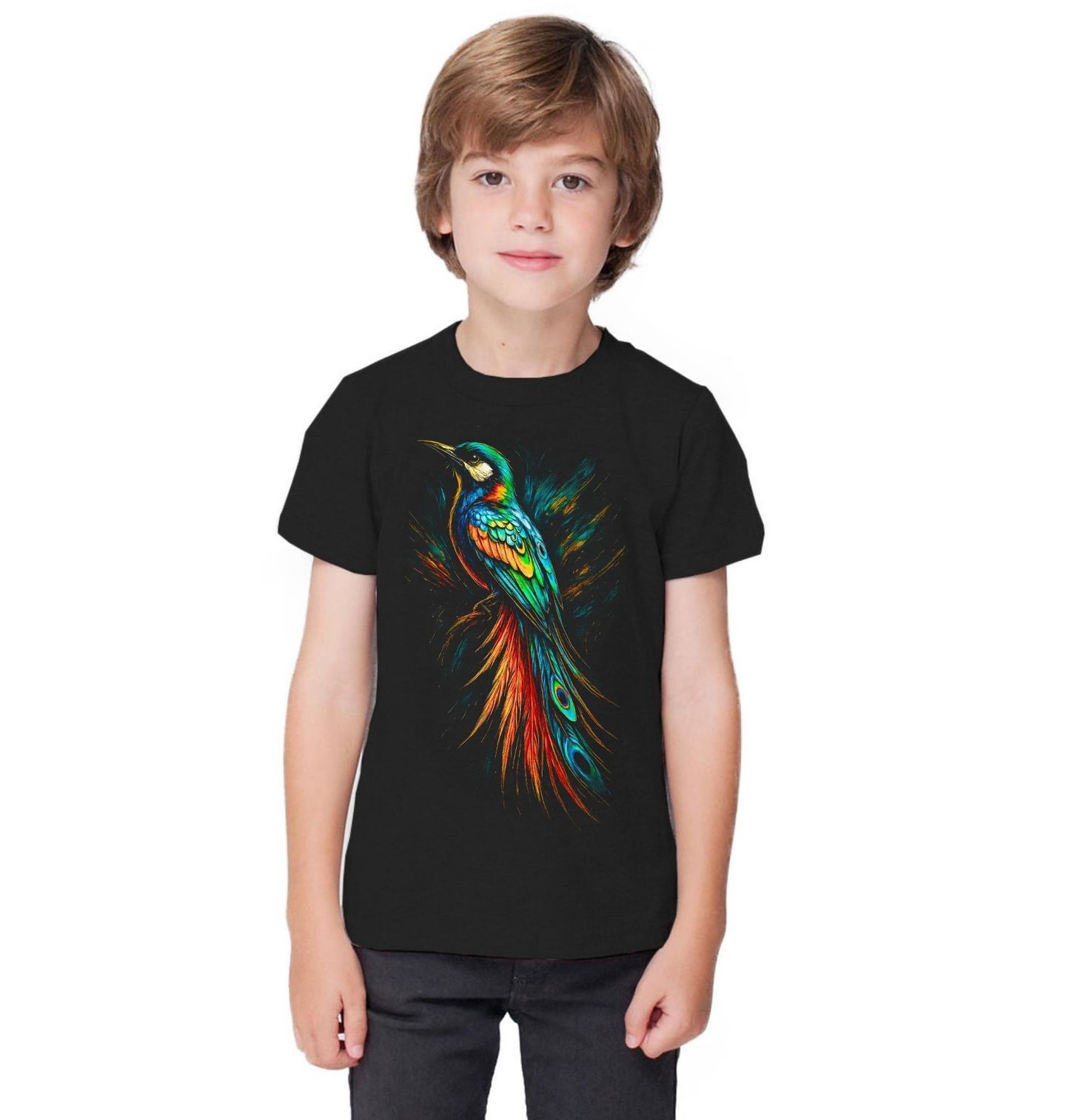 Dětské tričko Exotický Páv. Tento výrazný motiv zobrazuje majestátního ptáka inspirovaného pávem, který vyniká dlouhým, bohatě zdobeným ocasem a zářivými barvami. Pták působí elegantně, sebevědomě a exoticky, jeho peří hraje odstíny modré, zelené, tyrkysové i ohnivé oranžové. Detailní zpracování dodává motivu luxusní a umělecký vzhled.