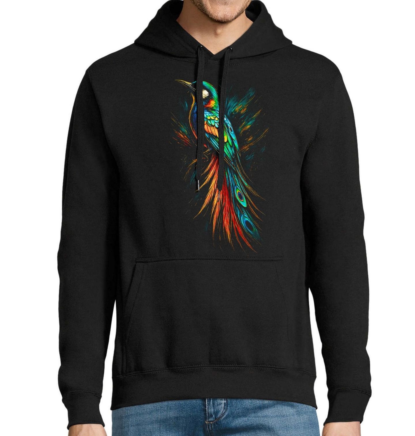 Pánská mikina Exotický Páv. Tento výrazný motiv zobrazuje majestátního ptáka inspirovaného pávem, který vyniká dlouhým, bohatě zdobeným ocasem a zářivými barvami. Pták působí elegantně, sebevědomě a exoticky, jeho peří hraje odstíny modré, zelené, tyrkysové i ohnivé oranžové. Detailní zpracování dodává motivu luxusní a umělecký vzhled.