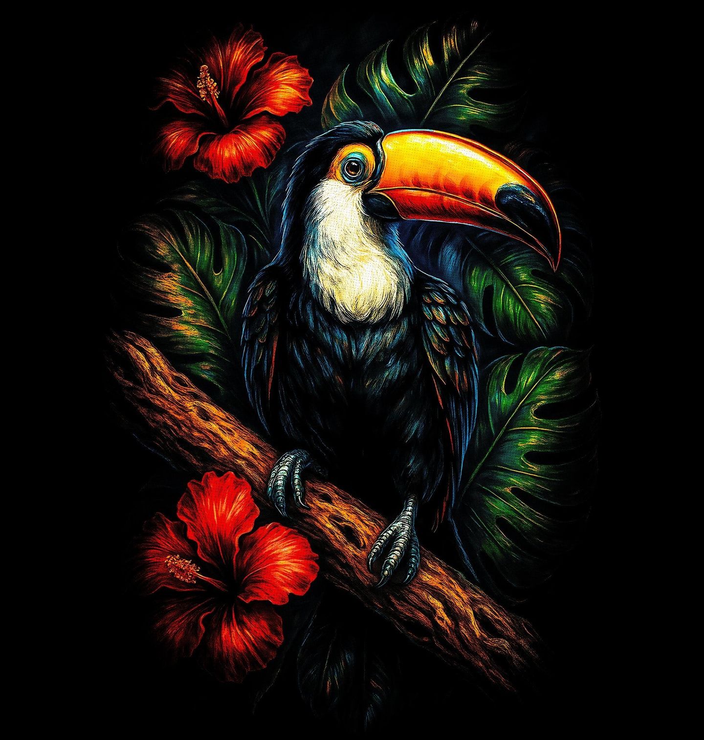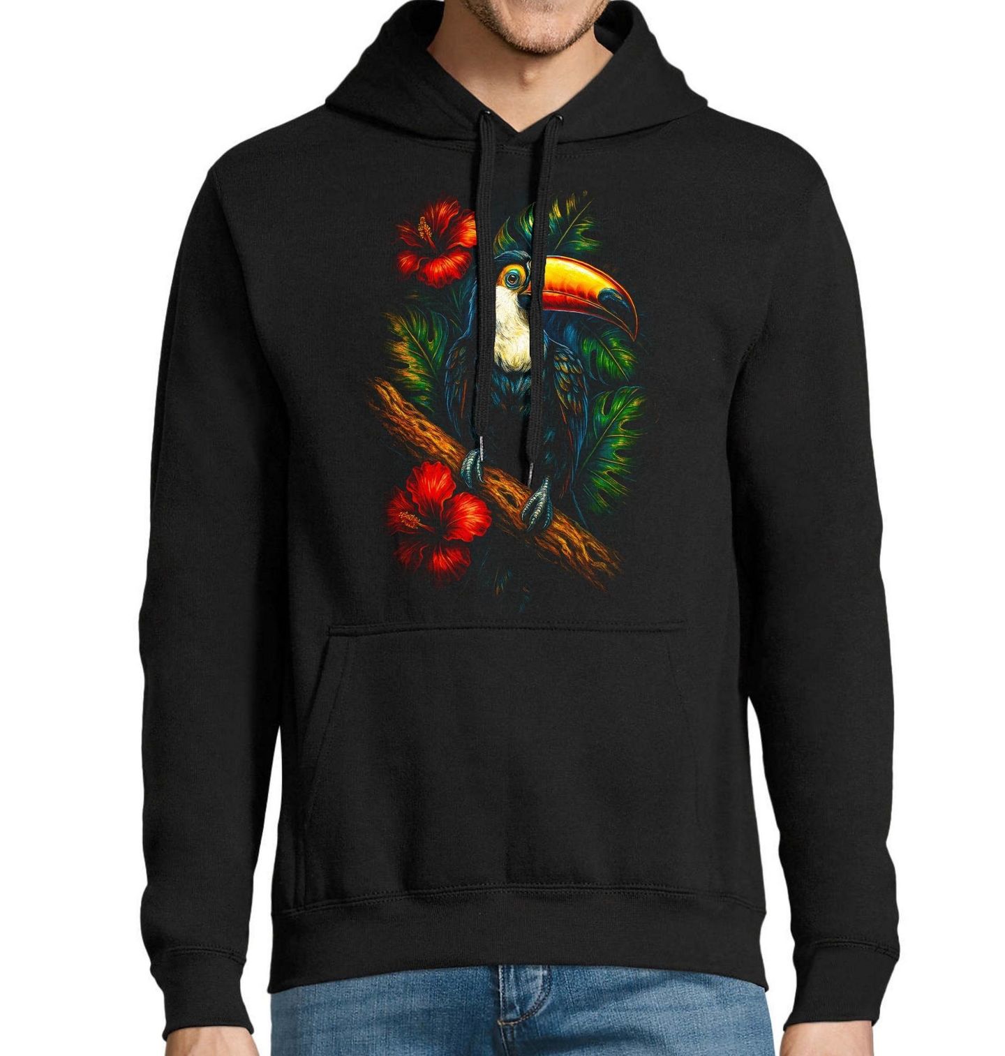 Pánská mikina Exotický Tukan obrovský. Tukan obrovský je charismatický pták, známý svým velkým barevným zobákem a klidným, pozorovatelským postojem. V mnoha kulturách je tento pták symbolem exotiky, rovnováhy a spojení s přírodou. Motiv je ideální pro milovníky tropů, barev a výrazného designu, který dodá prostoru energii a originalitu.