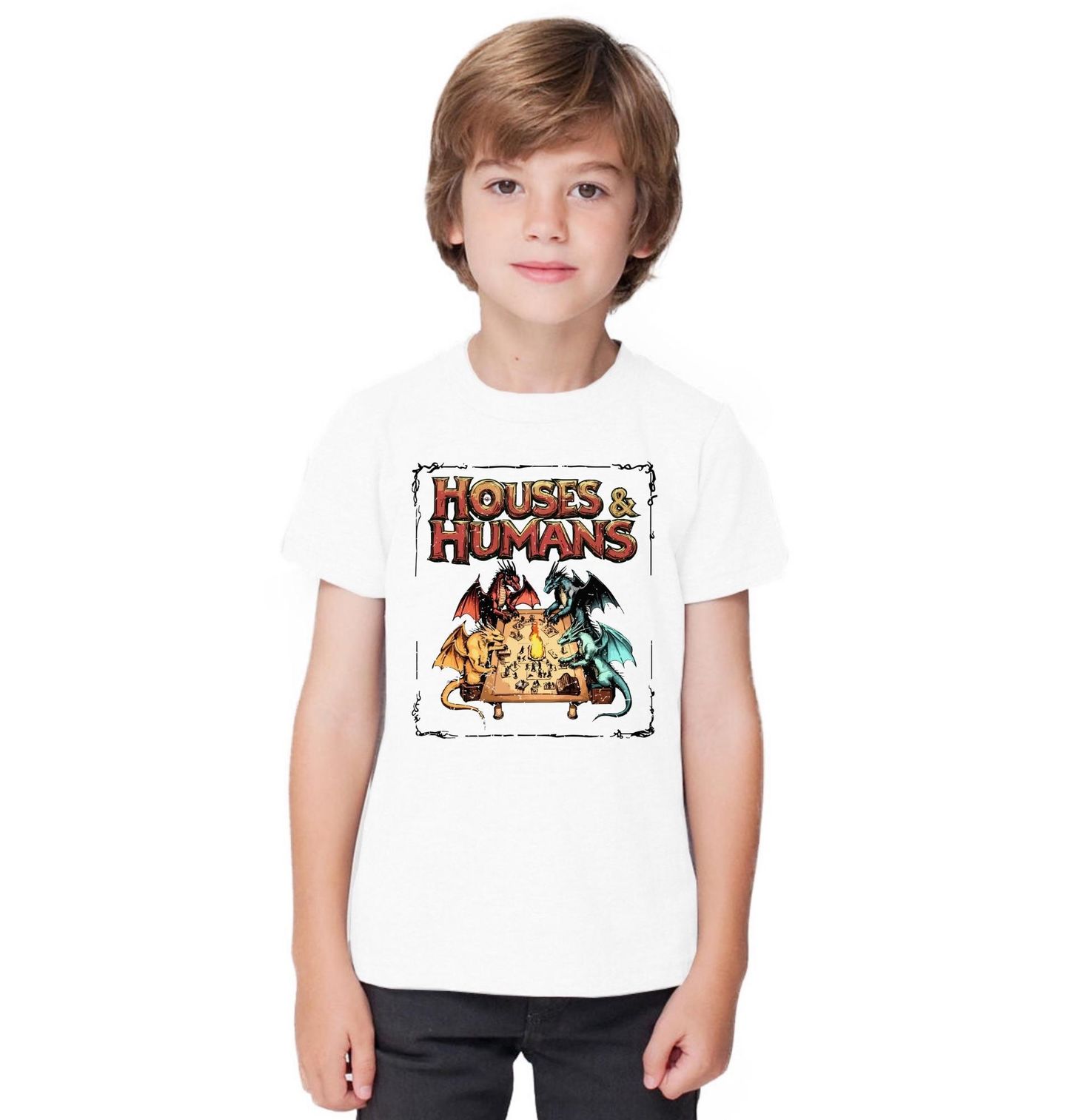 Dětské tričko Fantasy Hra Draků Houses & Humans. Ilustrace „Houses & Humans“ (parodie na „Dungeons & Dragons“) ukazuje 4 draky hrající stolní hru o lidech. Název znamená „Domy a lidé“ a obrací klasickou roli hráčů.