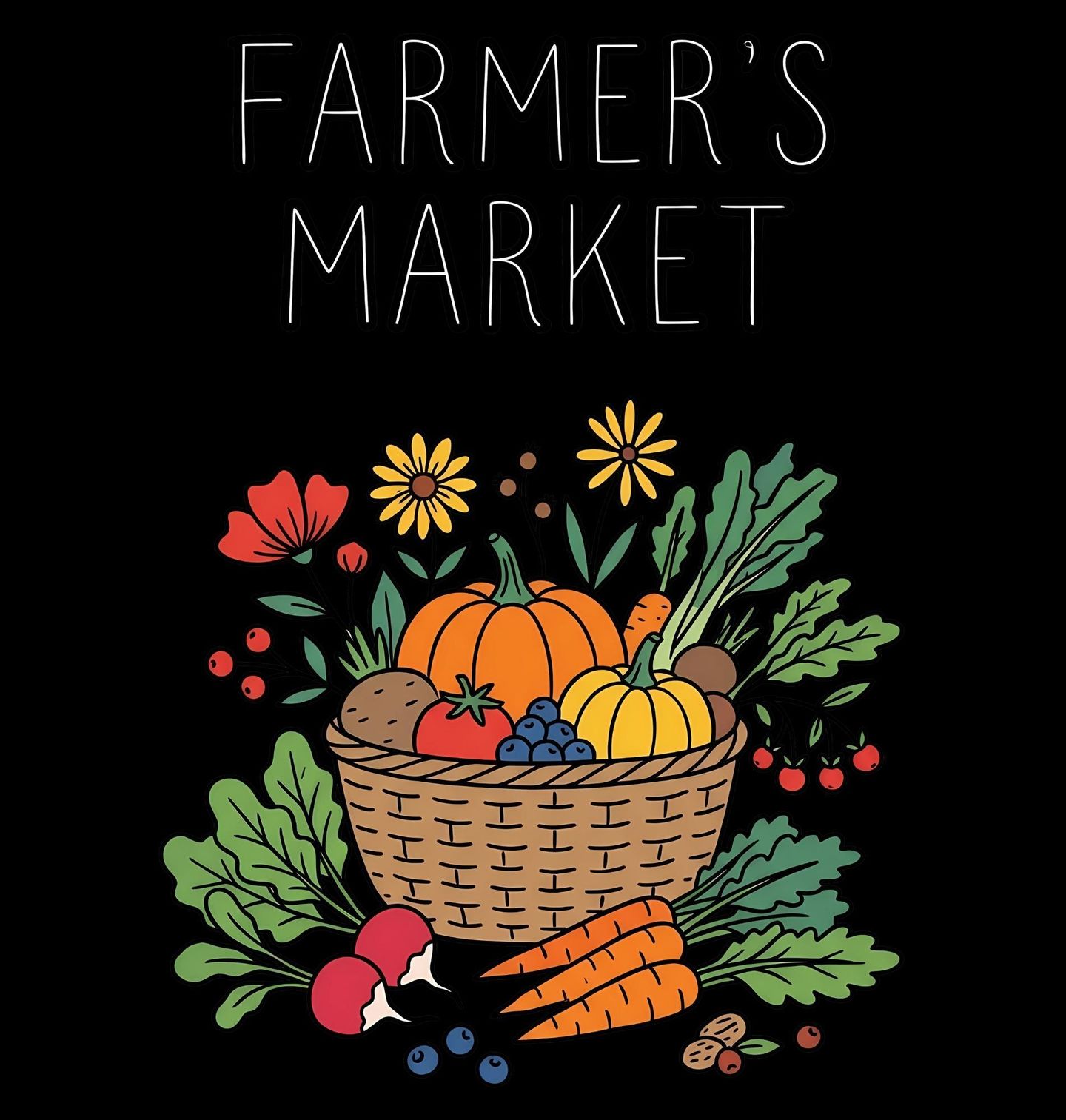 Dětské tričko Farmářské Trhy Farmer’s Market. Stylový a hravý motiv zobrazuje proutěný košík plný čerstvých plodů a bylinek. Na ilustraci je ovoce a zelenina – dýně, mrkev, ředkvičky, brambory, rajče, borůvky i zelené listy, doplněné květinami v jemném přírodním stylu. Skvělý motiv pro ty, kteří to mají k srdci všude tam, kde je farma doma.
