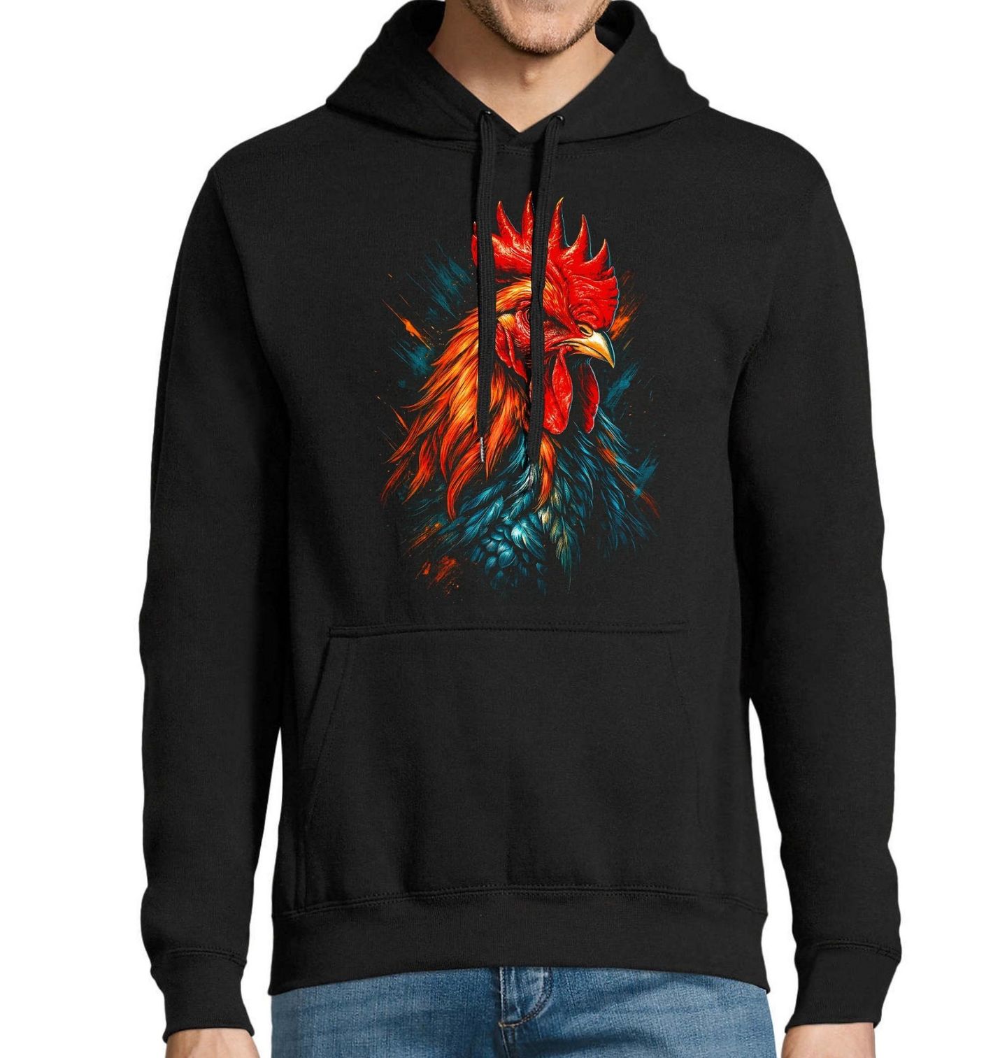 Pánská mikina Farmářský Kohout. Kohout jako pták je od nepaměti symbolem bdělosti, síly a dominance. Na farmě představuje přirozeného strážce a vůdce hejna – zde je zachycen jako skutečný král dvora. Design je ideální pro milovníky venkova, zvířat, farmářské tematiky i pro ty, kteří mají rádi výrazné a originální umění.