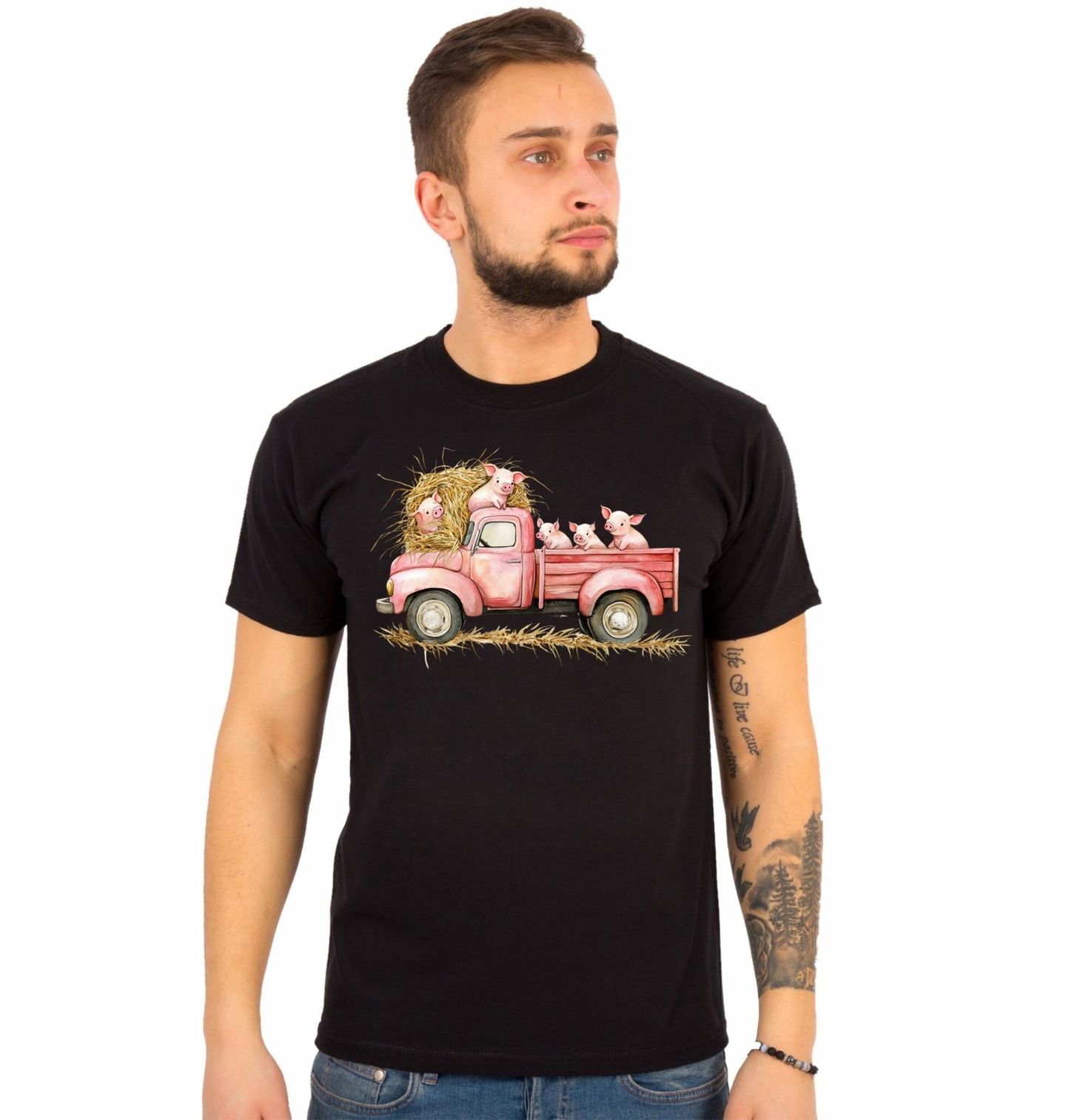 Pánské tričko Farmářský Pickup plný Prasátek. Roztomilý motiv zachycuje starý venkovský pickup, na kterém se veze parta veselých zvířat. Dominantním prvkem je každé malé prase, které dodává ilustraci humor a radost. Celý design krásně vystihuje atmosféru, jakou má pravá farma, kde každý farmář pečuje o svá zvířata s láskou. Tento motiv je ideální pro všechny, kdo milují venkovský život, kde farma není jen místo, ale životní styl.