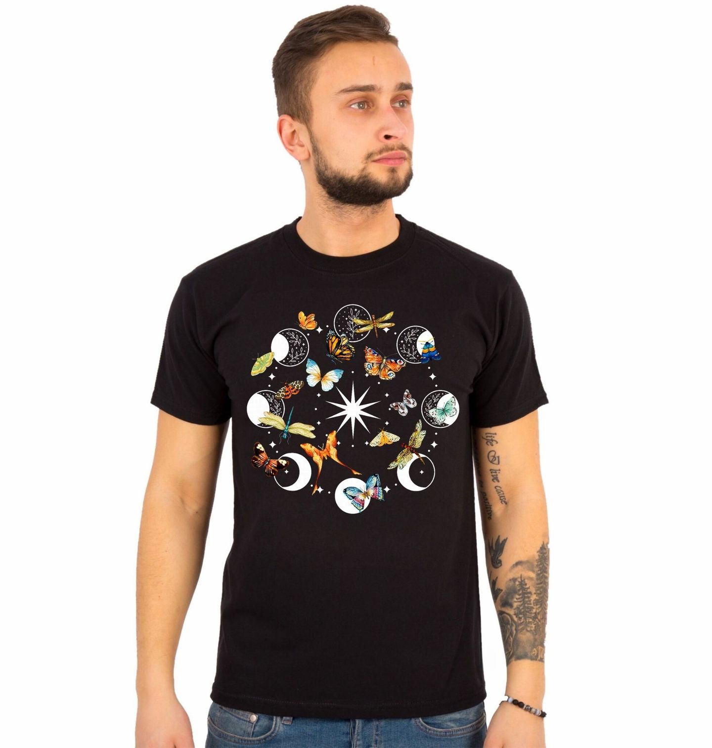 Pánské tričko Fáze Měsíce mezi Motýly. Elegantní a jemný motiv plný barevného života, kde se prolíná motýl a další hmyz v magickém kruhu kolem měsíčních fází. Tento design zaujme svou harmonií a symbolikou – motýl jako symbol proměny, krásy a svobody je doplněn různorodým hmyzem, který vytváří jedinečný a přirozený celek.
