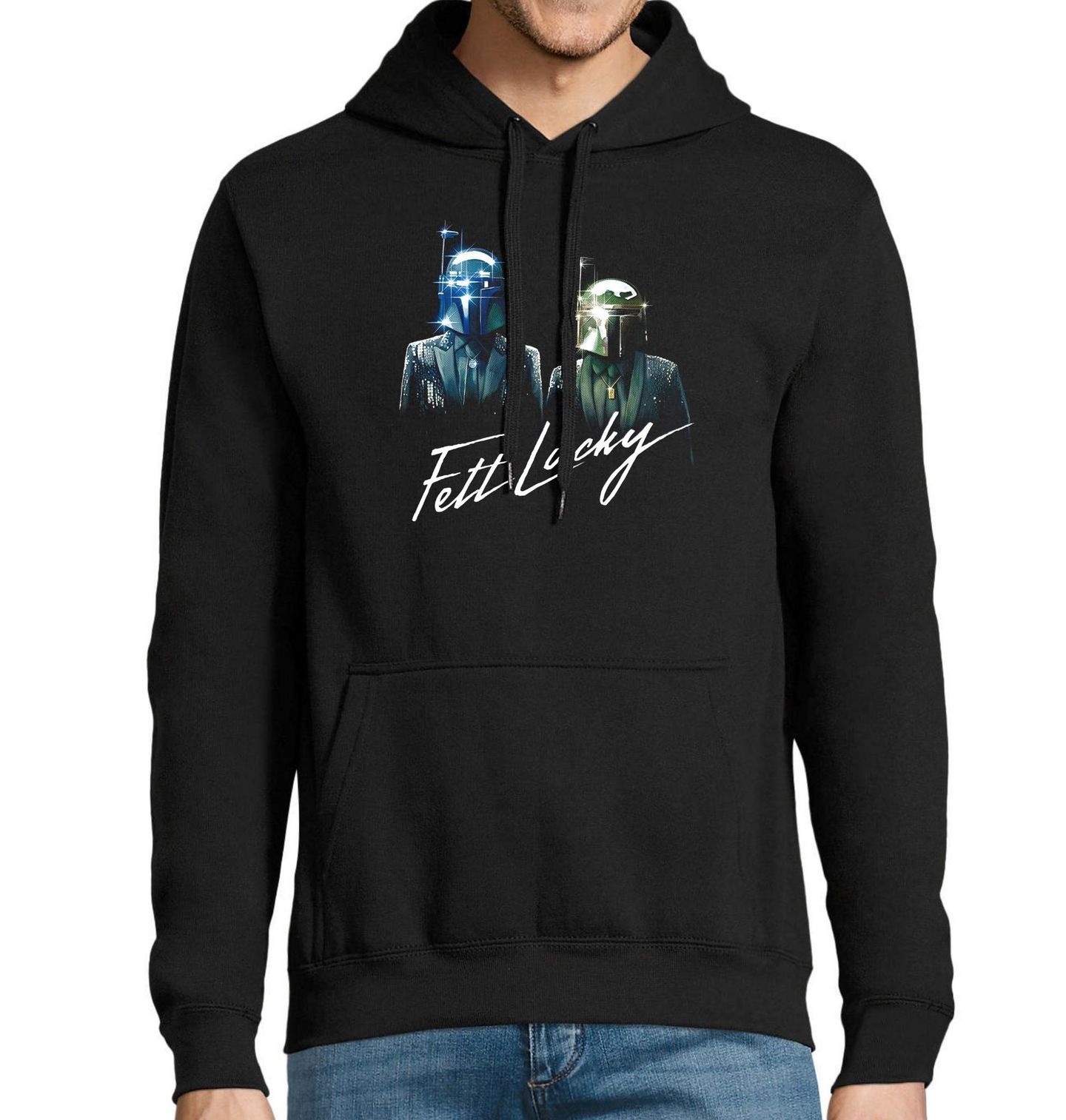 Pánská mikina Fett Lucky. Boba Fett je slavný námezdní lovec z vesmíru Star Wars, známý svou mandalorianskou helmou, chladnokrevností a ikonickým brněním. Design trička zároveň vizuálně odkazuje na legendární francouzské duo Daft Punk, které proslulo svým futuristickým elektro-funkem a robotickými helmami. „Fett Lucky“ – odkazuje na jejich hit Get Lucky.