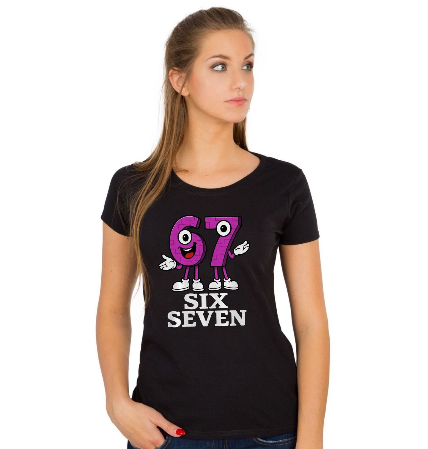 Dámské tričko Fialová Čísla 67 Six Seven. Motiv 67 ve stylu six seven meme přináší dvě roztomilá fialová čísla s očima, úsměvem a botami. Skvěle se hodí pro děti i dospělé, kteří milují hravý design a vtípky se čísly. Veselý, pozitivní a nepřehlédnutelný motiv, který zaručeně vykouzlí úsměv.
