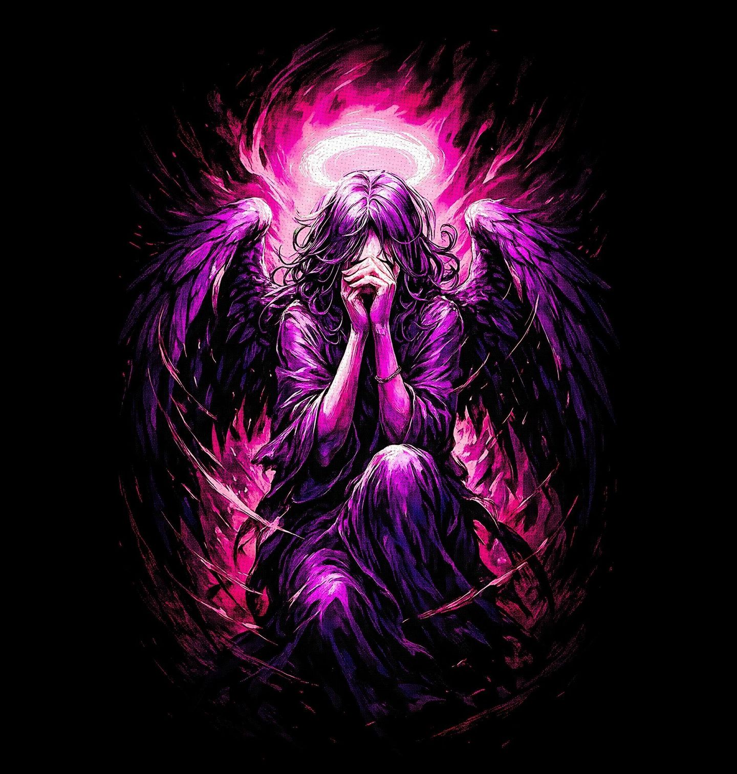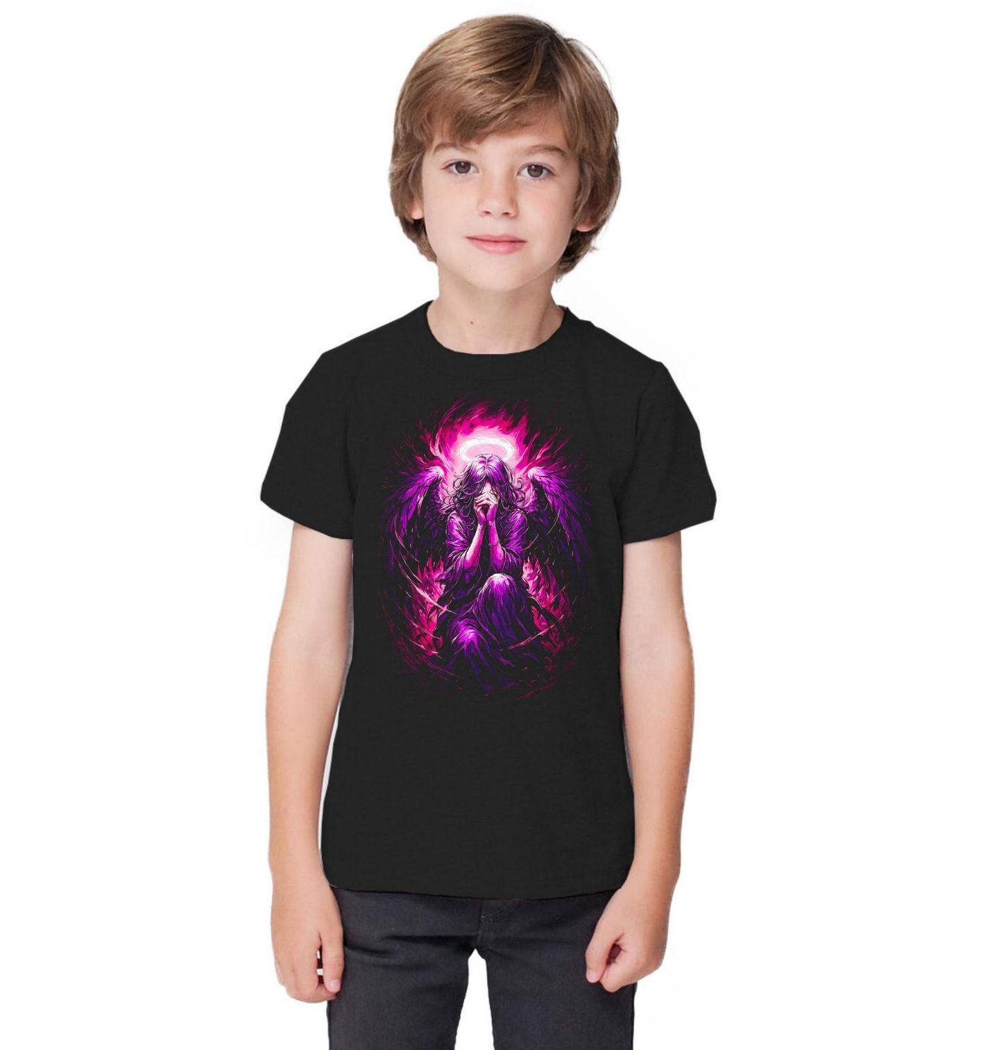 Dětské tričko Fialová Svatozář Anděla. Silný a emotivní motiv zobrazuje anděl, zahalený do temnoty a fialové energie, klečící v hlubokém zamyšlení nebo bolesti. Postava působí jako padlý anděl, který ztratil svou cestu, ale stále v sobě nese světlo – symbolizované zářící svatozáří nad hlavou. Design vyniká kontrastem temnoty a zářivé fialové barvy, což z něj dělá výrazný kousek pro každého, kdo má rád hlubší významy a silnou vizuální estetiku.