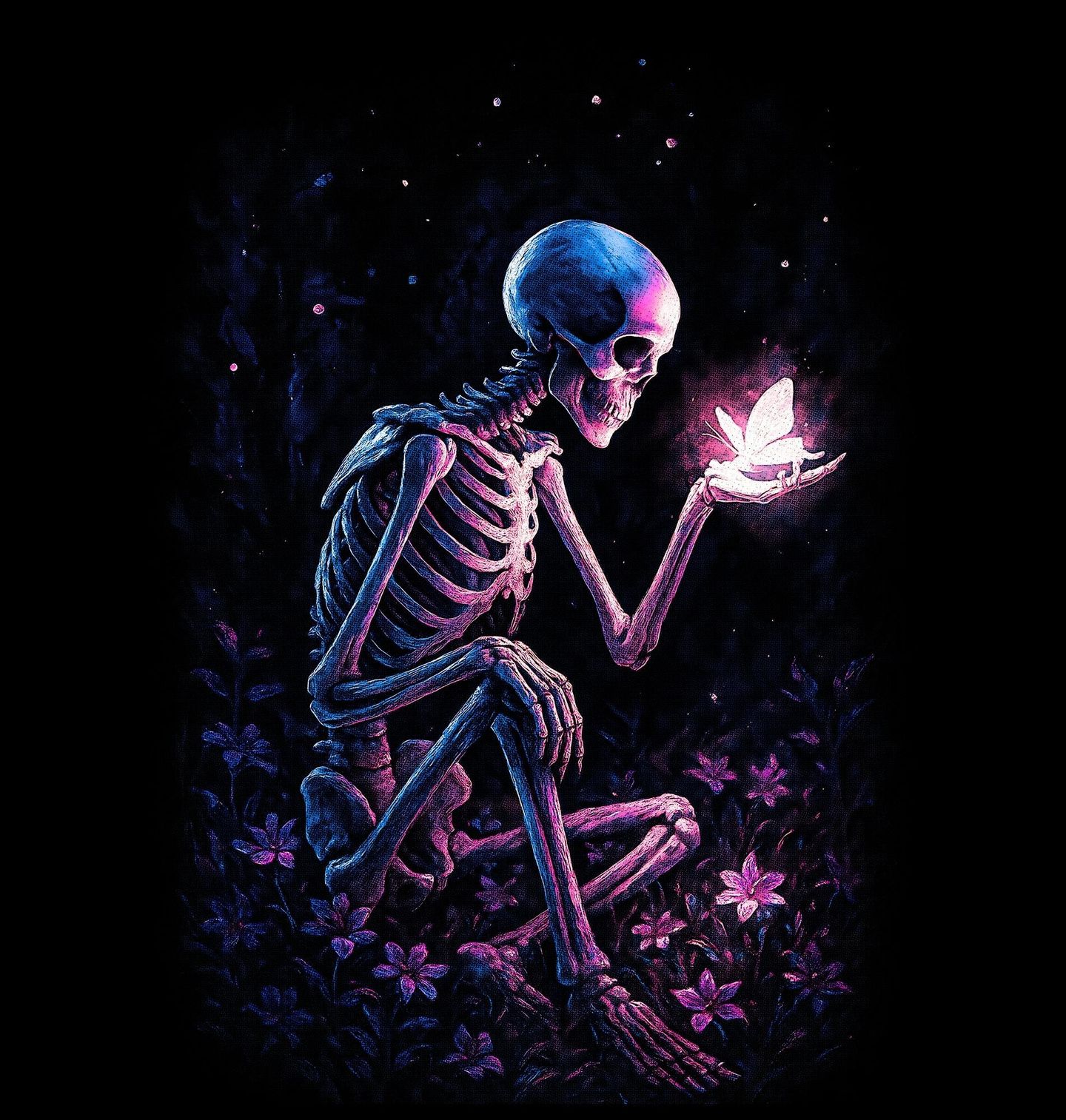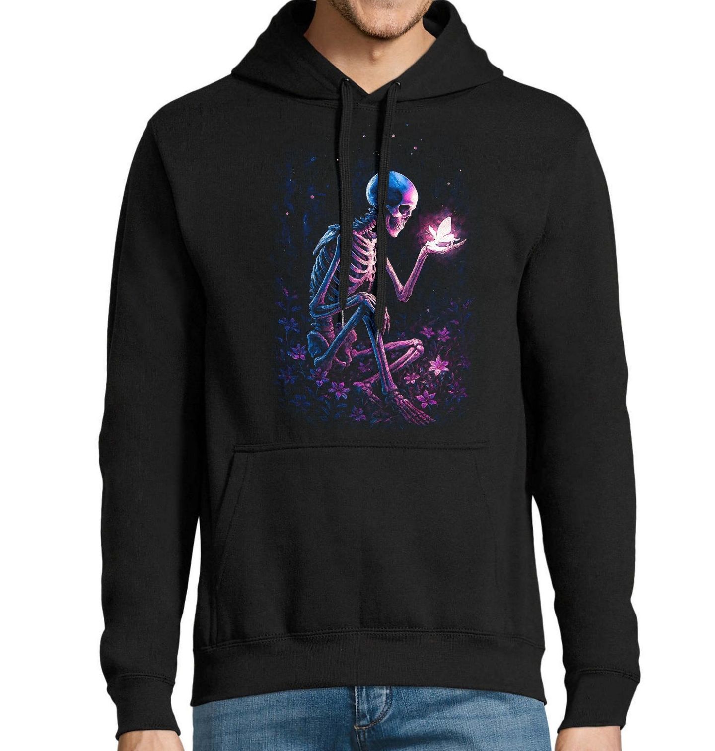Pánská mikina Fialový Motýl v Dlaních Kostlivce. Jedinečný motiv, kde kostlivec tiše sedí v temné zahradě a pozoruje zářícího motýla, symbol naděje, proměny a nového začátku. Kontrast mezi smrtí a křehkou krásou vytváří silný vizuální příběh plný emocí, klidu i tajemství. Moderní neonové barvy dodávají designu unikátní atmosféru, která zaujme každého milovníka originálního stylu, mystiky a hlubší symboliky.