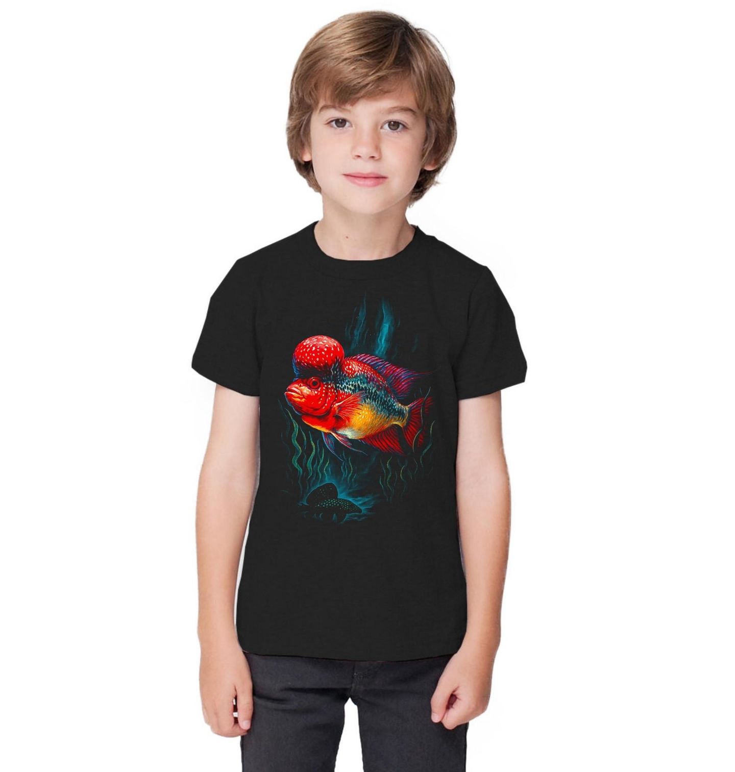 Dětské tričko Flowerhorn. Dominantní a exotický motiv zachycuje Flowerhorn cichlid, jedinečnou cichlidu proslulou výrazným čelním hrbolem a sytými červenými a modrými barvami. Motiv osloví každého rybáře, kterého fascinuje svět ryb a podvodní dravá elegance, i milovníky rybaření, kteří oceňují charakter, respekt a vášeň k vodní říši.