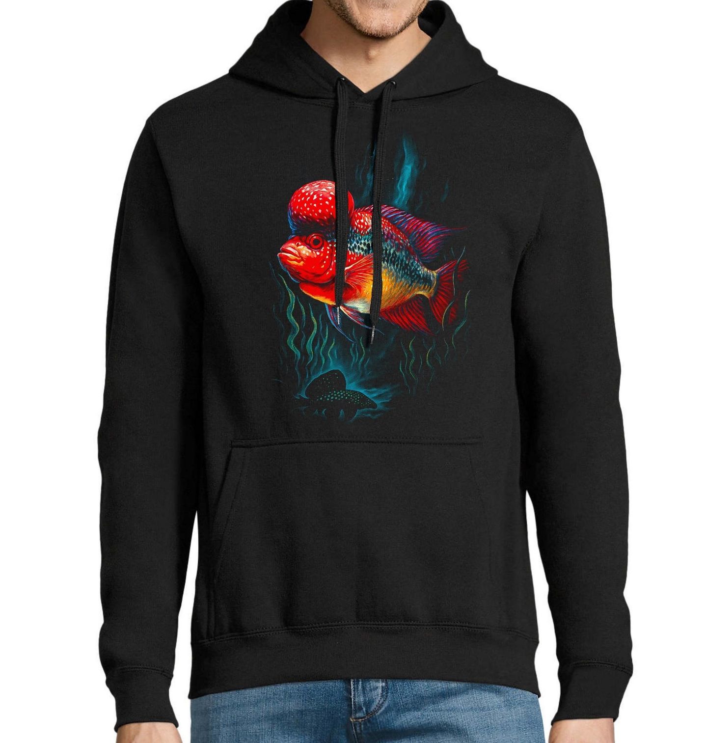 Pánská mikina Flowerhorn. Dominantní a exotický motiv zachycuje Flowerhorn cichlid, jedinečnou cichlidu proslulou výrazným čelním hrbolem a sytými červenými a modrými barvami. Motiv osloví každého rybáře, kterého fascinuje svět ryb a podvodní dravá elegance, i milovníky rybaření, kteří oceňují charakter, respekt a vášeň k vodní říši.