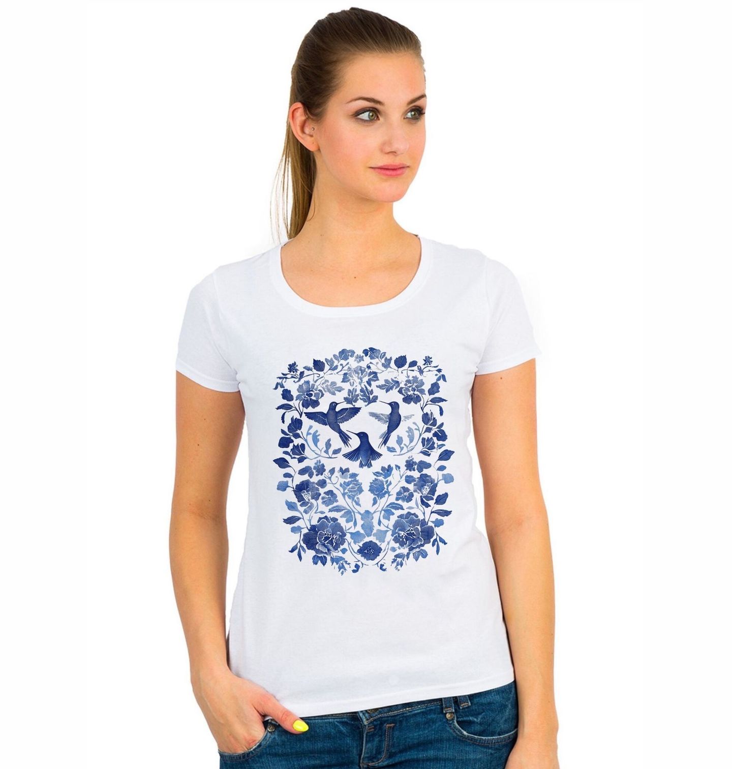 Dámské tričko Folk Ptáčci mezi Květy. Modrobílá barevnost připomíná klasické lidové vzory a vytváří nadčasový ornament plný klidu a krásy. Pták symbolizuje svobodu, lehkost a život, zatímco květiny dodávají motivu přírodní něhu a dekorativní bohatost. Styl folk propojuje inspiraci lidovým uměním s moderním zpracováním, díky čemuž motiv působí autenticky i současně.