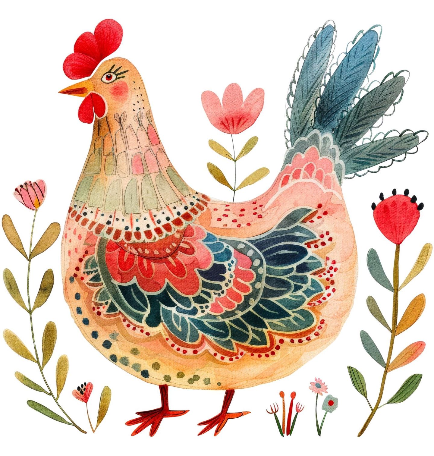 Dámské tričko Folklórní Slepice. Tato něžná ilustrace přináší radostný venkovský styl, kde hraje hlavní roli slepice obklopená jemnými květinovými motivy. Design v duchu folk estetiky propojuje přírodu, tradici a lehkost každodenního života na venkově. Barevná slepice působí hravě a zároveň uklidňujícím dojmem, takže se skvěle hodí jako originální doplněk pro každého, kdo miluje farmu a lidový styl.