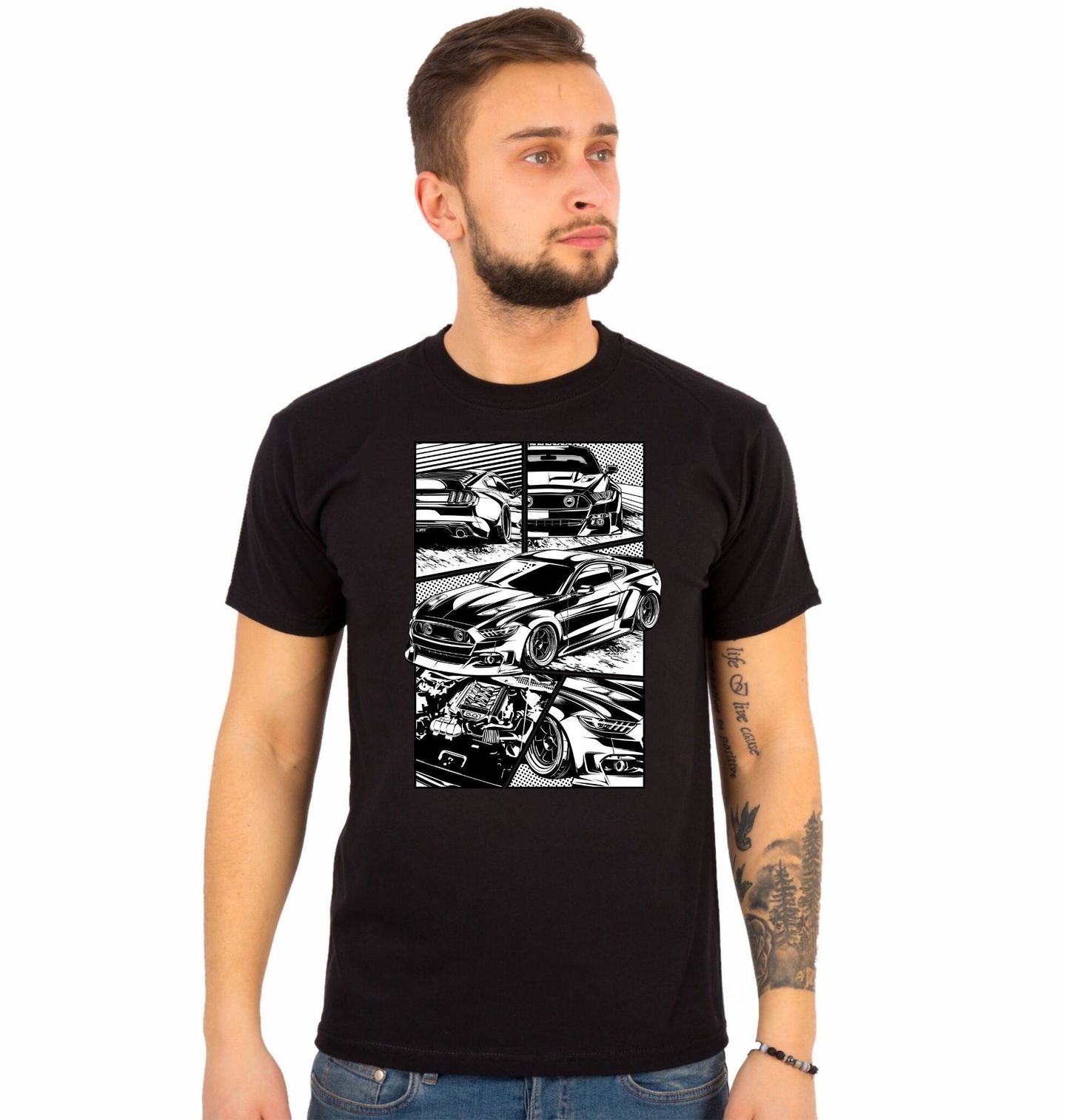 Pánské tričko Ford Mustang Comic Muscle Car. Originální motiv inspirovaný komiksovou grafikou představuje ikonické americké auto ve výrazném street stylu. Dynamické panely, detaily karoserie a agresivní linie vytváří vzhled jako vystřižený z automobilového komiksu, který zaujme každého fanouška výkonu a tuningu. Motiv kombinuje sílu muscle car kultury s grafickým stylem manga a comic artu, takže působí energicky a moderně.