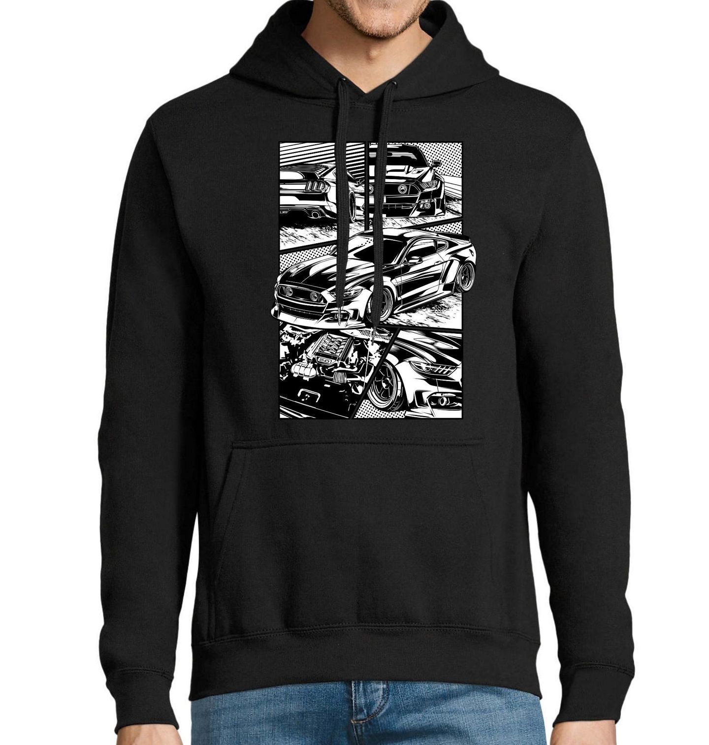 Pánská mikina Ford Mustang Comic Muscle Car. Originální motiv inspirovaný komiksovou grafikou představuje ikonické americké auto ve výrazném street stylu. Dynamické panely, detaily karoserie a agresivní linie vytváří vzhled jako vystřižený z automobilového komiksu, který zaujme každého fanouška výkonu a tuningu. Motiv kombinuje sílu muscle car kultury s grafickým stylem manga a comic artu, takže působí energicky a moderně.