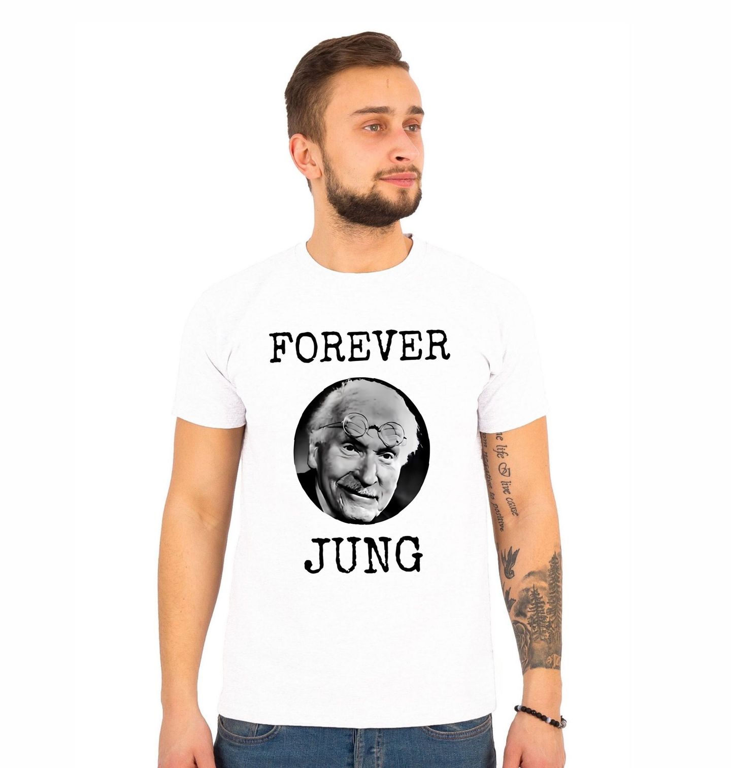 Pánské tričko Forever Jung. Minimalistický portrét s textem „FOREVER JUNG“ (Navždy Jung) odkazuje na slavného psychologa. Carl Gustav Jung byl švýcarský lékař-psychiatr a psychoterapeut, zakladatel analytické psychologie. Jeho přínos psychologii spočívá v pochopení lidské psychiky na pozadí světa snů, umění, mytologie, náboženství a filosofie.