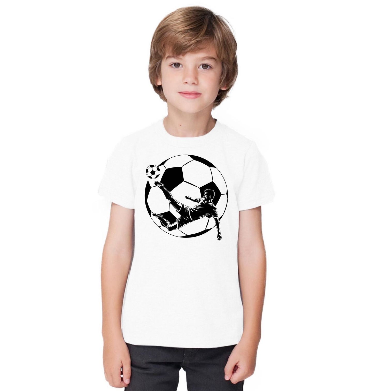 Dětské tričko Fotbalista Nůžky v Letu. Dynamický motiv zachycuje ikonický moment, kdy hráč předvádí efektní „nůžky“ – jeden z nejatraktivnějších triků, který fotbal jako vášnivý sport nabízí. Silueta hráče v pohybu spolu s velkým míčem vytváří výrazný a energický design, který okamžitě upoutá pozornost. Minimalistické černobílé provedení podtrhuje sílu okamžiku a dává vyniknout detailům, díky kterým je fotbal nejen hra, ale i umění.