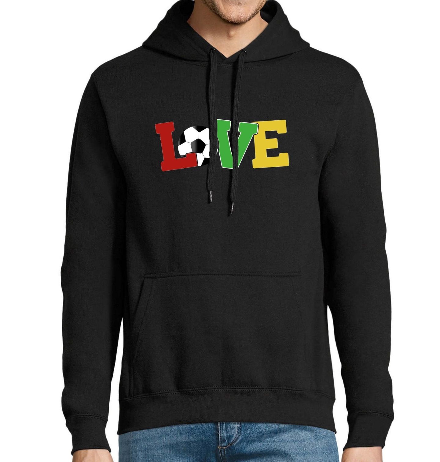 Pánská mikina Fotbalová láska LOVE. Motiv „LOVE“ s fotbalovým míčem místo písmene O je ideální pro každého sportovce, pro kterého je láska a fotbal nerozlučná dvojka. Výrazné barevné písmo v kombinaci s klasickým fotbalovým míčem dává jasně najevo, co nosíš v srdci.