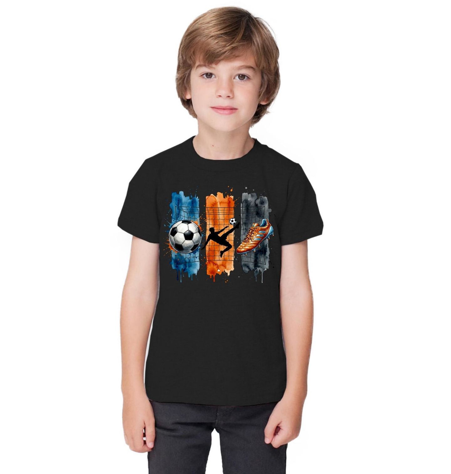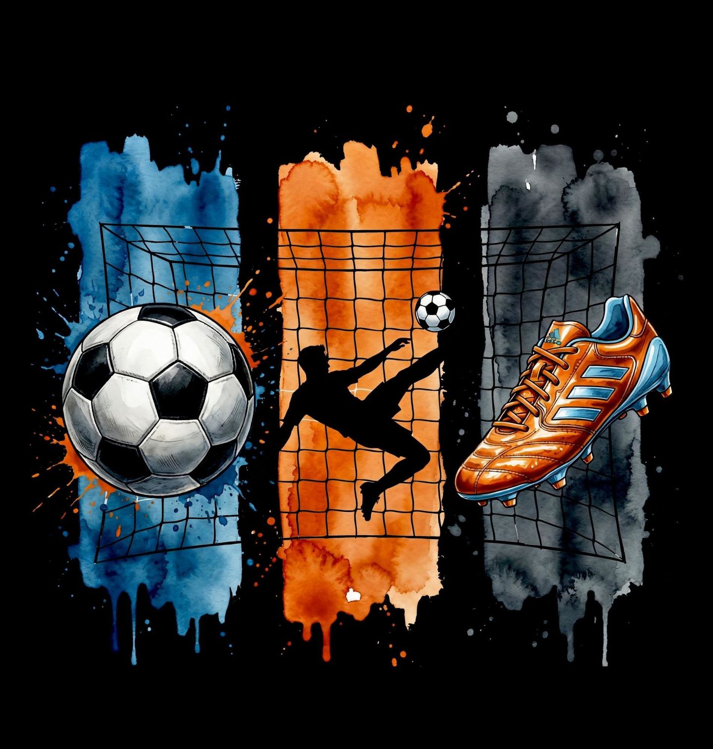 Dětské tričko Fotbalový Míč a Kopačky. Výrazný a dynamický motiv spojuje prvky, které definují fotbal jako nejoblíbenější sport na světě. Silueta hráče při akrobatickém kopu, míč i kopačka vytvářejí silnou kompozici plnou pohybu, energie a vášně. Barevné kontrasty a umělecký styl dodávají designu moderní vzhled, který zaujme každého fanouška. Tento motiv dokonale vystihuje, co znamená fotbal – rychlost, dovednost a radost ze hry, kterou nabízí každý sportovní zážitek.