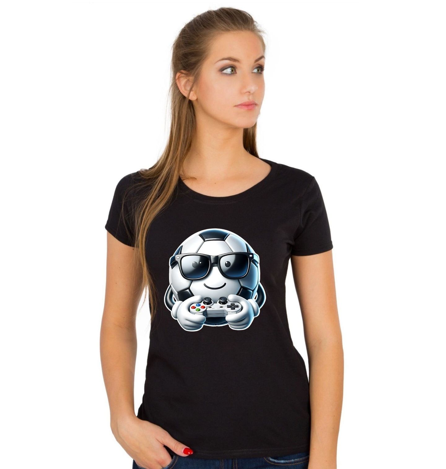 Dámské tričko Fotbalový Míč Gamer v Brýlích. Roztomilý motiv, který spojuje fotbal a herní svět. Usmívající se fotbalový míč s brýlemi drží v rukou ovladač a vypadá jako opravdový gamer. Ideální pro každého, kdo miluje sport i videohry. Tento design je hravý, moderní a skvěle se hodí pro děti i dospělé fanoušky fotbalu.