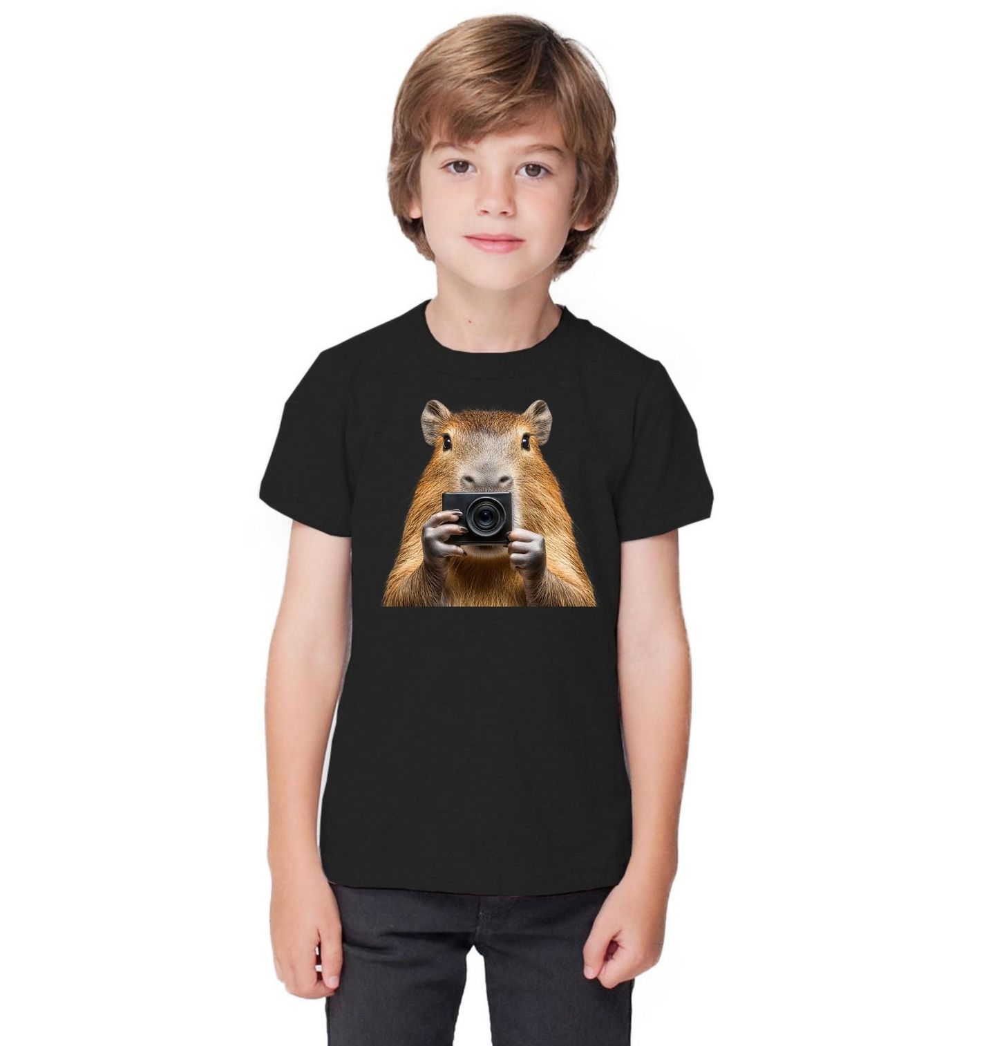 Dětské tričko Fotograf Kapybara. Originální design zachycuje roztomilou kapybara, která se proměnila ve stylového fotograf a drží fotoaparát připravený na další snímek. Motiv působí hravě a moderně, takže skvěle doplní outfit každého, kdo miluje zvířata, humor i svět focení.