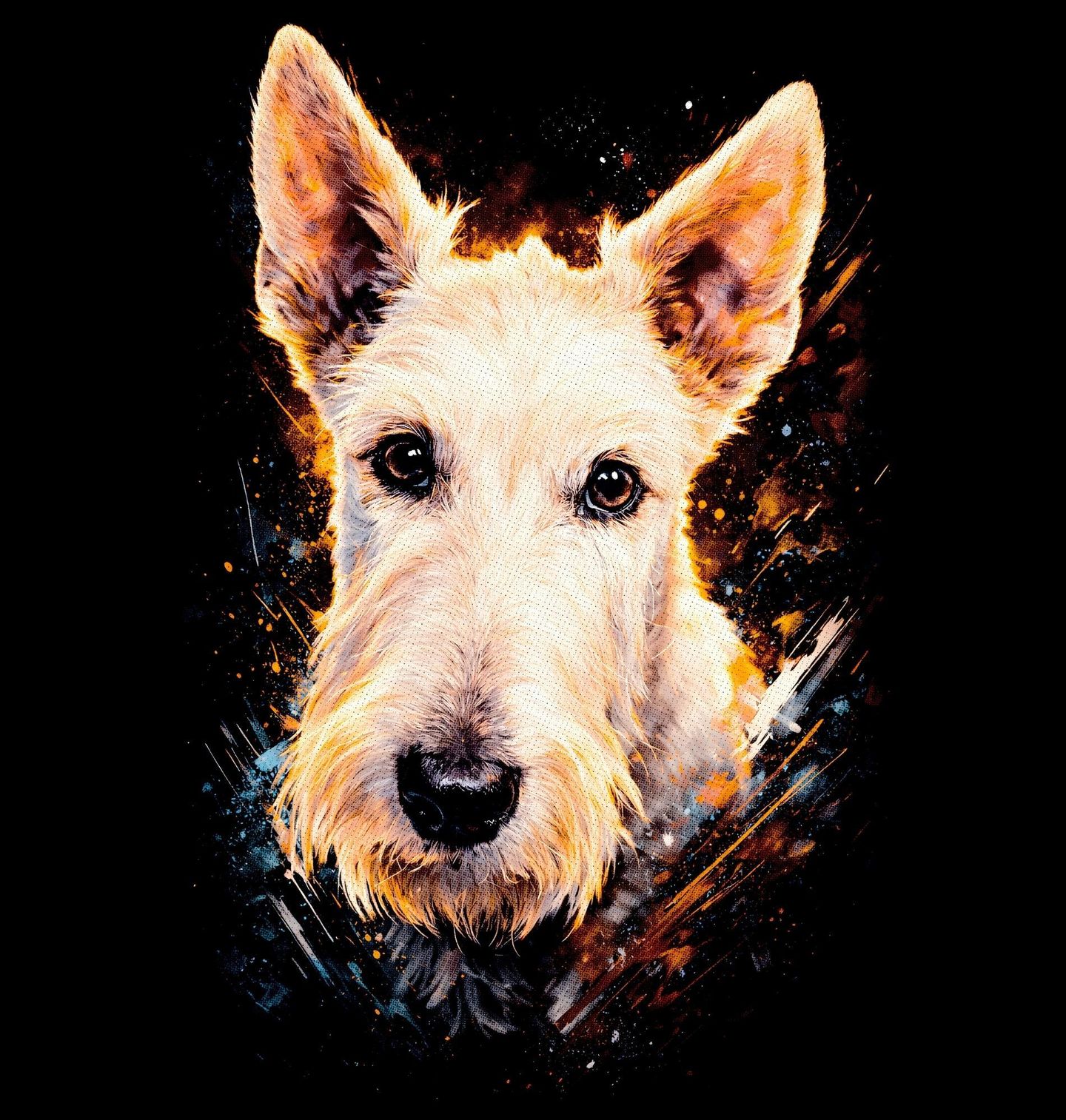 Pánská mikina Foxteriér. Tento výrazný motiv zachycuje inteligentního a energického psa plemene Foxteriér (hladkosrstý) v moderním, uměleckém stylu plném kontrastních barev. Detailní zpracování zdůrazňuje typickou protáhlou hlavu, bystrý pohled a sebevědomý výraz, díky kterému je tento pes tak jedinečný.