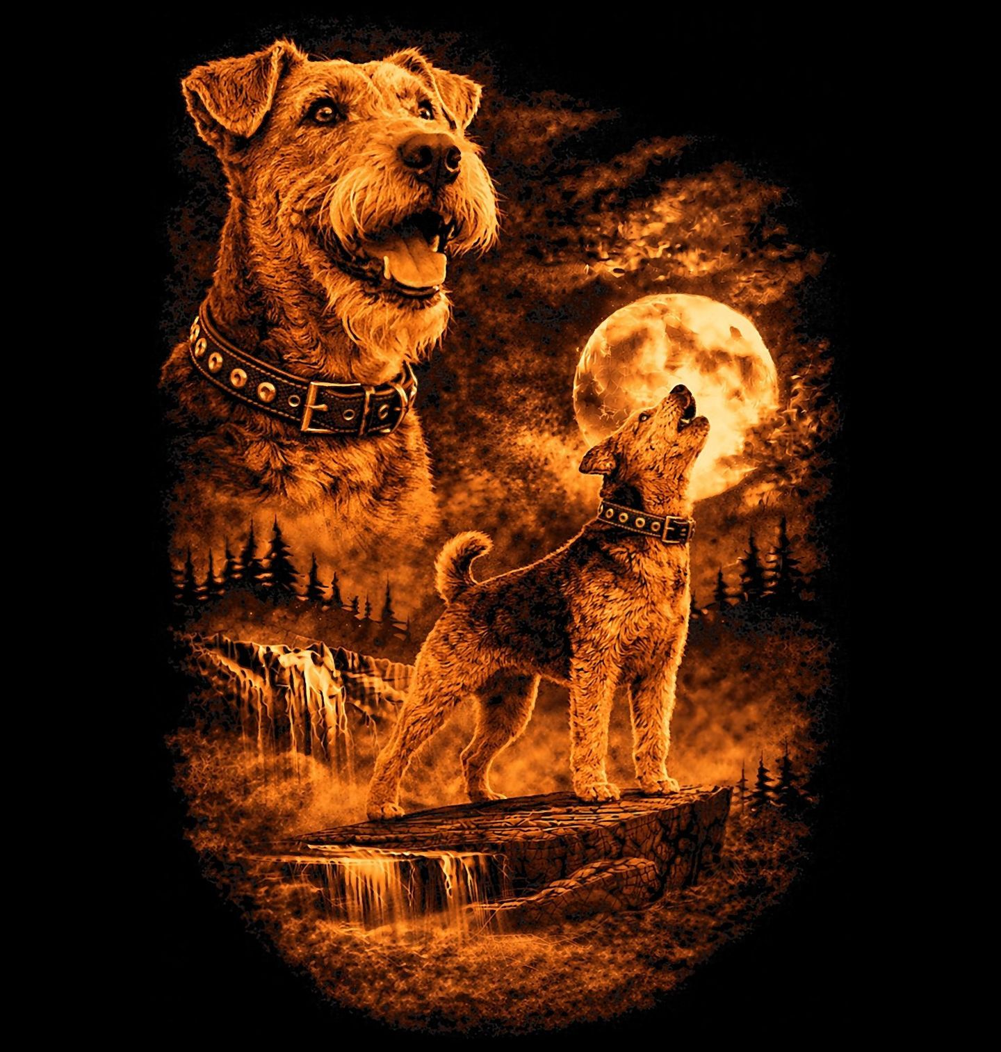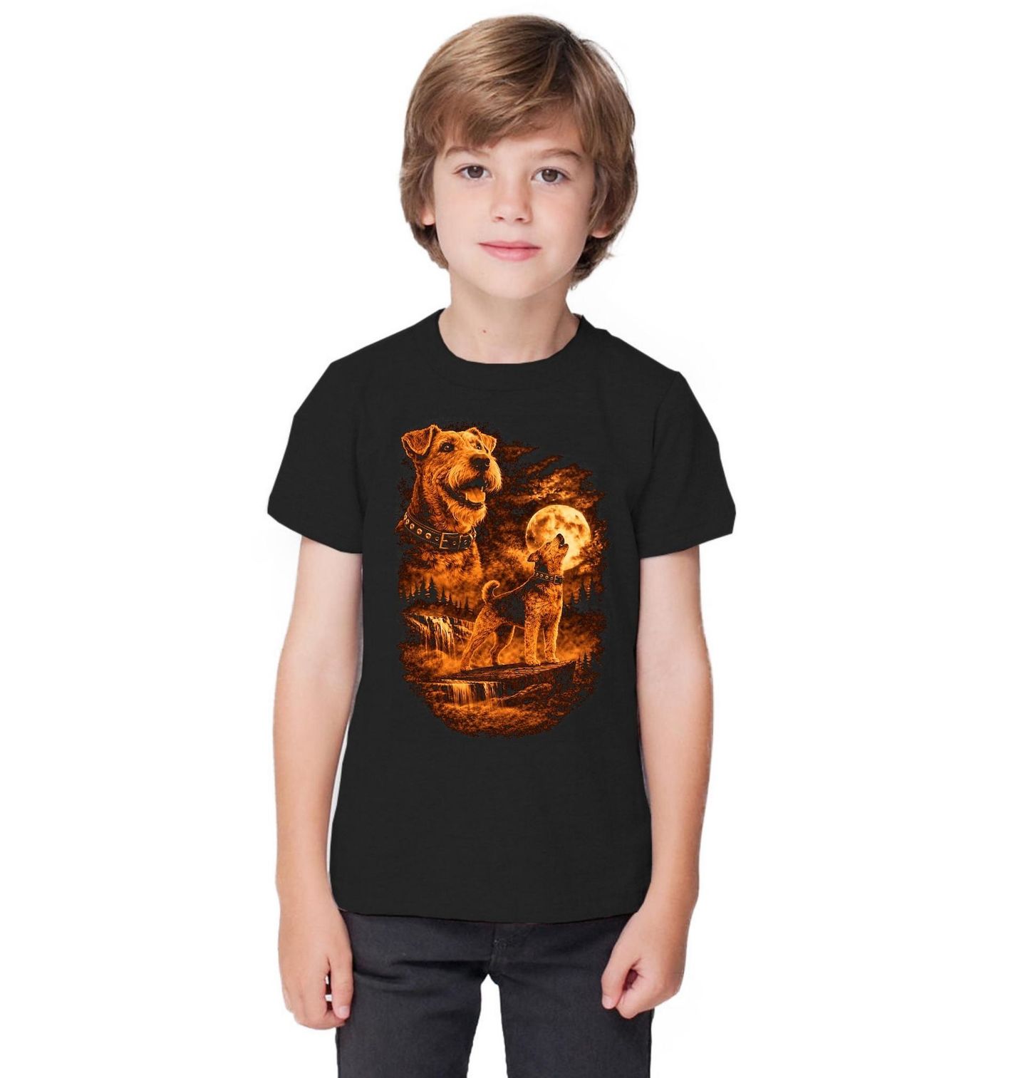 Dětské tričko Foxteriér a Kouzlo Úplňku. Dobrodružný motiv ukazuje psa plemene foxteriér stojícího na skále pod zářícím úplňkem. Okolní krajina s vodopádem a lesem vytváří epickou atmosféru, která symbolizuje odvahu, energii a nezdolného ducha tohoto plemene.