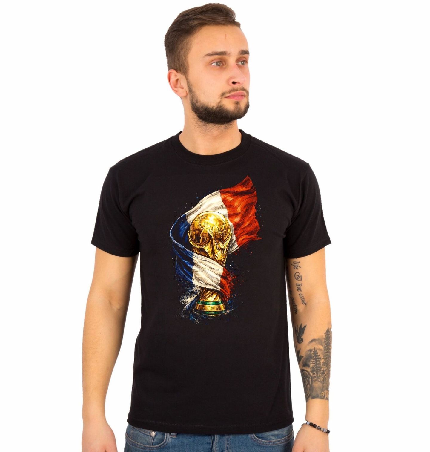 Pánské tričko Francouzská Trofej FIFA World Cup. Stylový motiv zachycuje ikonickou trofej Mistrovství světa ve fotbale zahalenou do národní vlajky, jakou má Francie. Modrá, bílá a červená barva symbolizuje sílu, eleganci a vítězného ducha, který Francie přináší na světová fotbalová hřiště. Zlatý pohár v kombinaci s vlající vlajkou vytváří výrazný design plný energie a sportovní vášně.