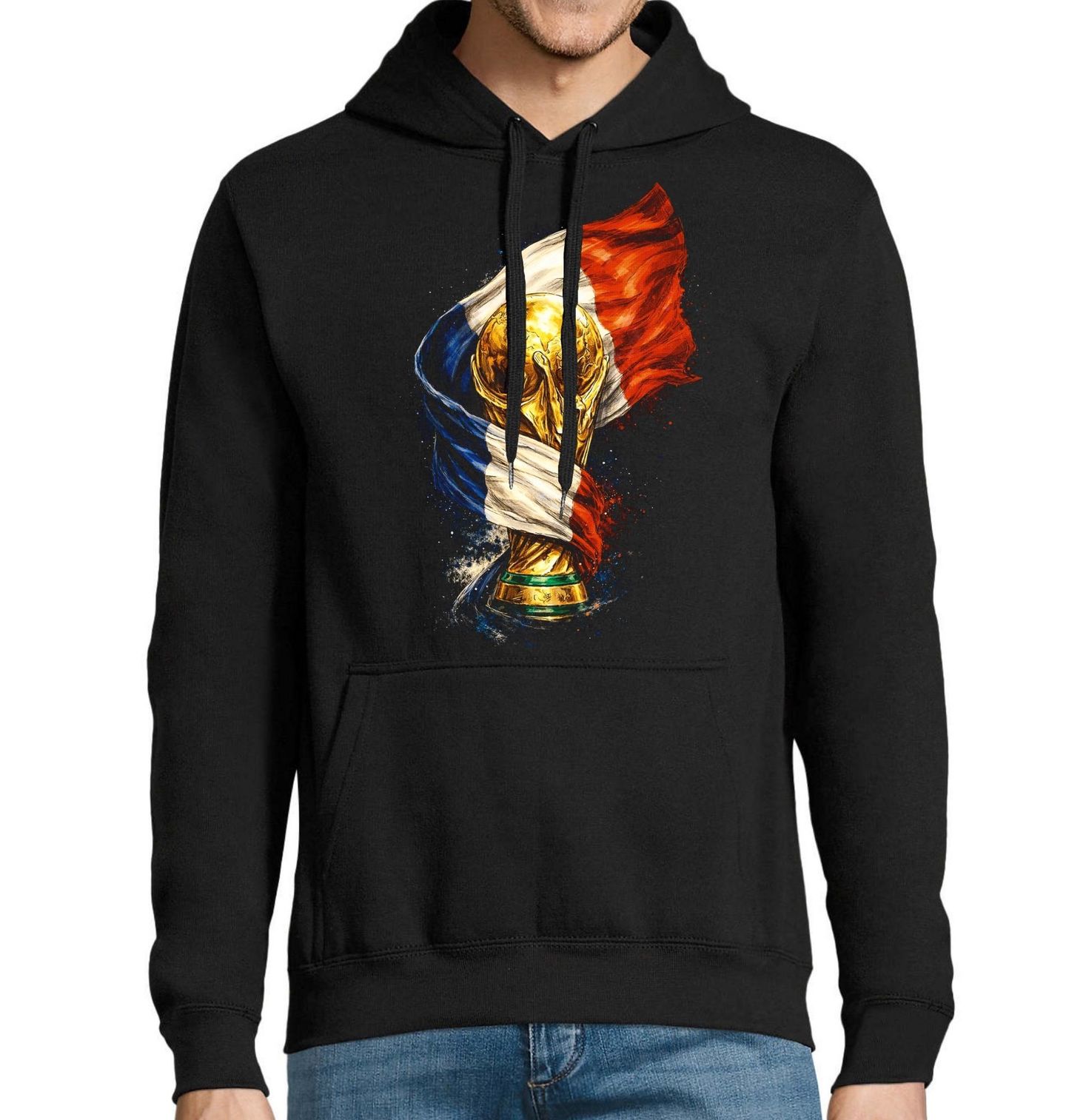 Pánská mikina Francouzská Trofej FIFA World Cup. Stylový motiv zachycuje ikonickou trofej Mistrovství světa ve fotbale zahalenou do národní vlajky, jakou má Francie. Modrá, bílá a červená barva symbolizuje sílu, eleganci a vítězného ducha, který Francie přináší na světová fotbalová hřiště. Zlatý pohár v kombinaci s vlající vlajkou vytváří výrazný design plný energie a sportovní vášně.